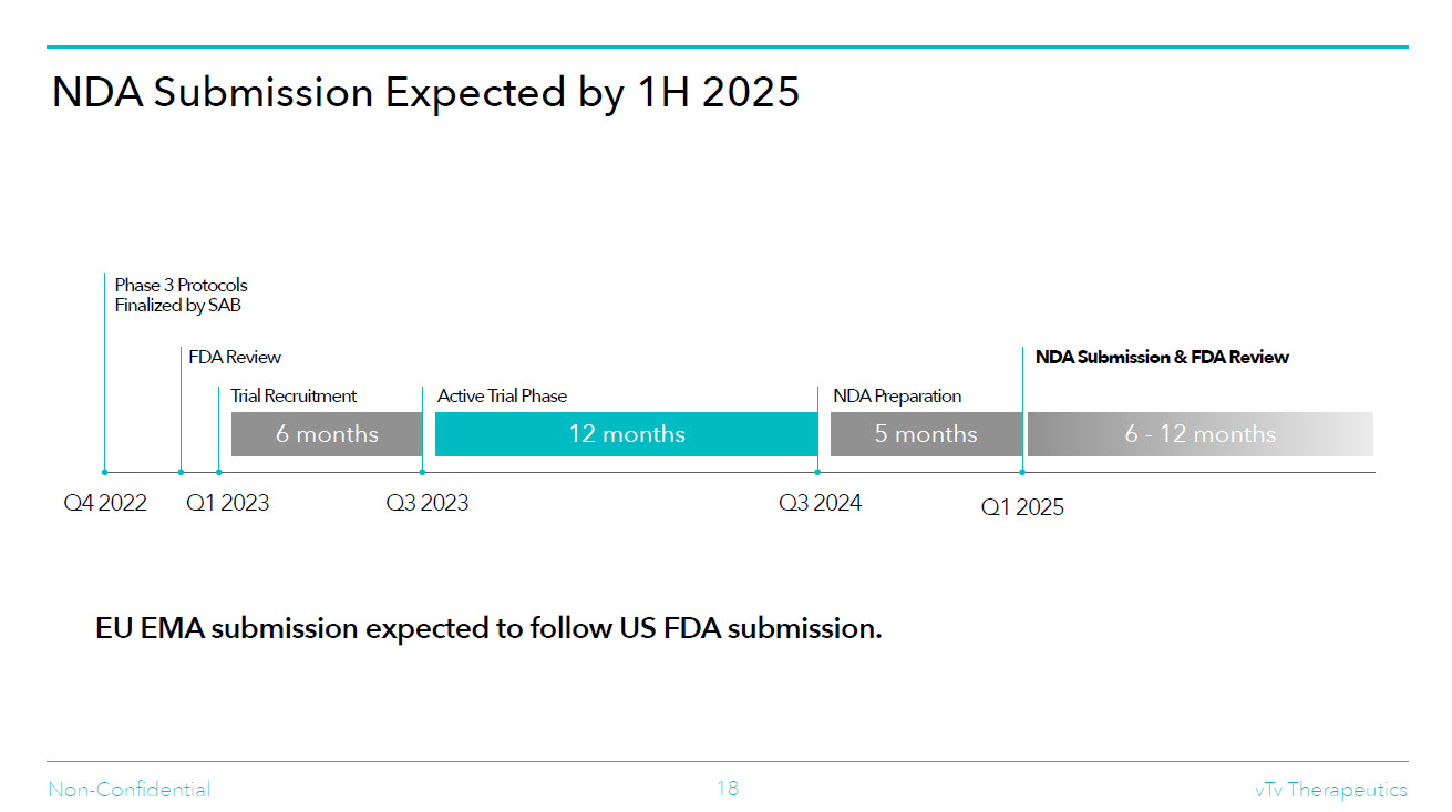 NDA Submission Expected by 1H 2025 Q4 2022 Q1 2023 Phase 3 Protocols Finalized by SAB FDA Review Trial Recruitment 6 months 12 months Active Trial Phase Q3 2023 Q3 2024 NDA Preparation 5 months Q1 2025 18 Non - Confidential vTv Therapeutics NDA Submission & FDA Review 6 - 12 months EU EMA submission expected to follow US FDA submission.