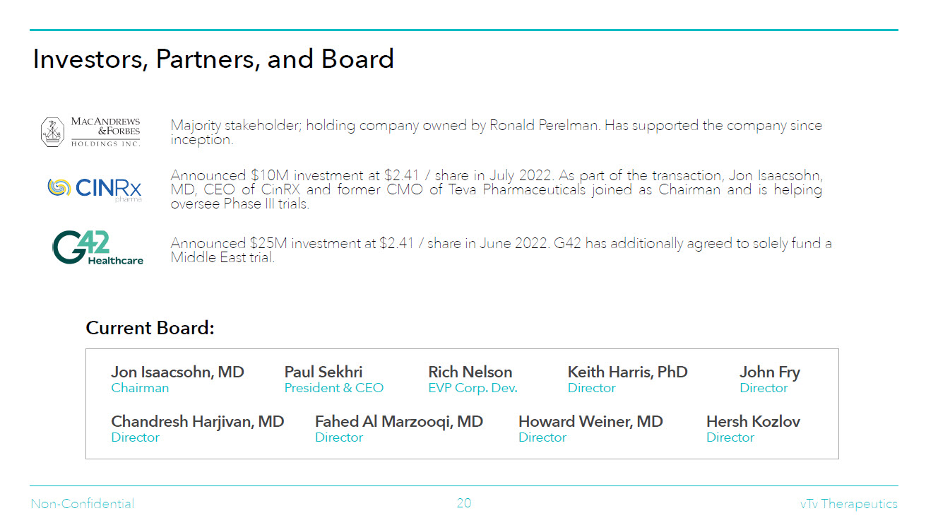 Investors, Partners, and Board Paul Sekhri President & CEO John Fry Director Hersh Kozlov Director Fahed Al Marzooqi, MD Director Jon Isaacsohn, MD Chairman Chandresh Harjivan, MD Director Keith Harris, PhD Director Howard Weiner, MD Director Rich Nelson EVP Corp. Dev. Current Board: Majority stakeholder ; holding company owned by Ronald Perelman . Has supported the company since inception . Announced $ 10 M investment at $ 2 . 41 / share in July 2022 . As part of the transaction, Jon Isaacsohn, MD, CEO of CinRX and former CMO of Teva Pharmaceuticals joined as Chairman and is helping oversee Phase III trials . Announced $25M investment at $2.41 / share in June 2022. G42 has additionally agreed to solely fund a Middle East trial. 20 Non - Confidential vTv Therapeutics
