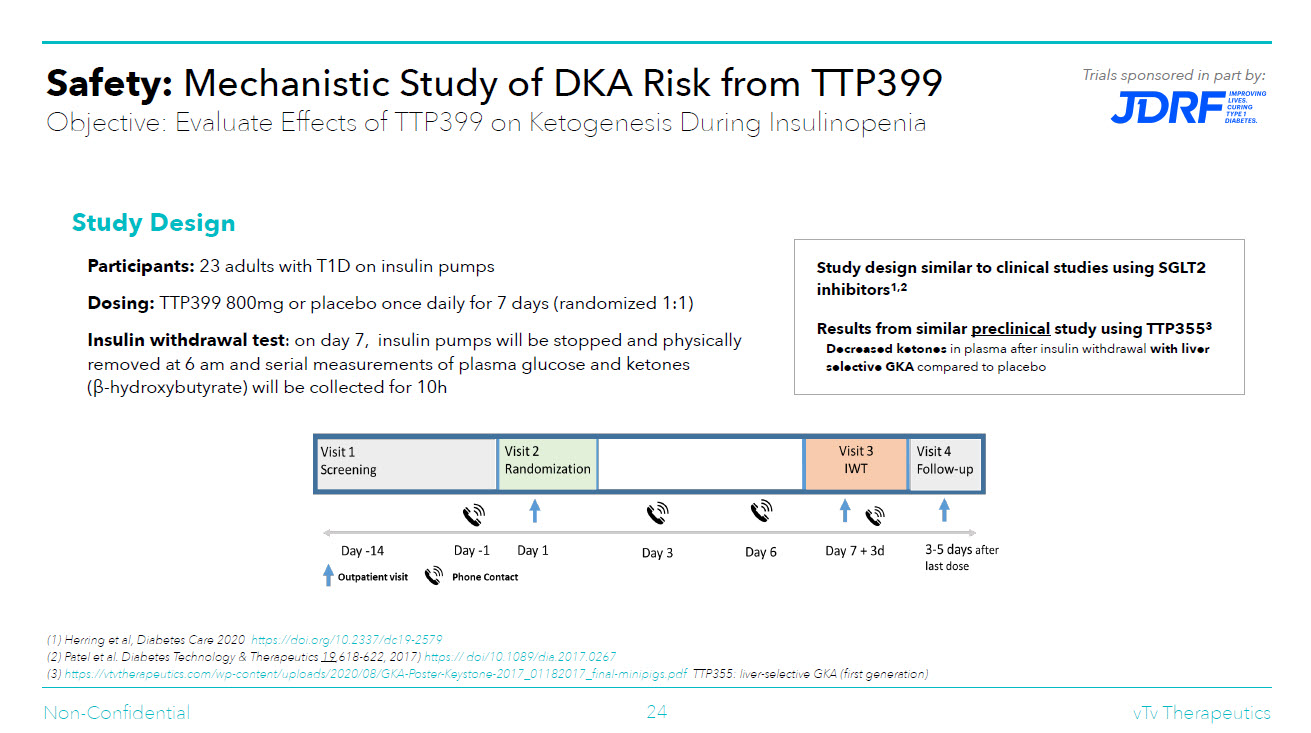 Safety: Mechanistic Study of DKA Risk from TTP399 Objective: Evaluate Effects of TTP399 on Ketogenesis During Insulinopenia Study Design Participants: 23 adults with T1D on insulin pumps Dosing: TTP399 800mg or placebo once daily for 7 days (randomized 1:1) Insulin withdrawal test : on day 7, insulin pumps will be stopped and physically removed at 6 am and serial measurements of plasma glucose and ketones ( β - hydroxybutyrate) will be collected for 10h Study design similar to clinical studies using SGLT 2 inhibitors 1 , 2 Results from similar preclinical study using TTP 355 3 Decreased ketones in plasma after insulin withdrawal with liver selective GKA compared to placebo (1) Herring et al, Diabetes Care 2020 https://doi.org/10.2337/dc19 - 2579 (2) Patel et al. Diabetes Technology & Therapeutics 19 ,618 - 622, 2017) https:// doi/10.1089/dia.2017.0267 (3) https://vtvtherapeutics.com/wp - content/uploads/2020/08/GKA - Poster - Keystone - 2017_01182017_final - minipigs.pdf TTP355: liver - selective GKA (first generation) Trials sponsored in part by: 24 Non - Confidential vTv Therapeutics