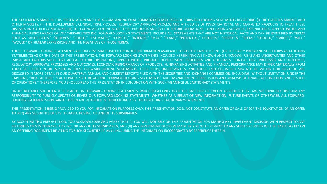 2 THE STATEMENTS MADE IN THIS PRESENTATION AND THE ACCOMPANYING ORAL COMMENTARY MAY INCLUDE FORWARD-LOOKING STATEMENTS REGARDING (I) THE DIABETES MARKET AND OTHER MARKETS, (II) THE DEVELOPMENT, CLINICAL TRIAL PROCESS, REGULATORY APPROVAL PROCESS AND ATTRIBUTES OF INVESTIGATIONAL AND MARKETED PRODUCTS TO TREAT THESE DISEASES AND OTHER CONDITIONS, (III) THE ECONOMIC POTENTIAL OF THOSE PRODUCTS AND (IV) THE FUTURE OPERATIONS, FUND-RAISING ACTIVITIES, EXPENDITURES, OPPORTUNITIES, AND FINANCIAL PERFORMANCE OF VTV THERAPEUTICS INC. FORWARD-LOOKING STATEMENTS INCLUDE ALL STATEMENTS THAT ARE NOT HISTORICAL FACTS AND CAN BE IDENTIFIED BY TERMS SUCH AS “ANTICIPATES,” “BELIEVES,” “COULD,” “ESTIMATES,” “EXPECTS,” “INTENDS,” “MAY,” “PLANS,” “POTENTIAL,” PREDICTS,” “PROJECTS,” “SEEKS,” “SHOULD,” “TARGET,” “WILL,” “WOULD” OR SIMILAR EXPRESSIONS AND THE NEGATIVES OF THOSE TERMS. THESE FORWARD-LOOKING STATEMENTS ARE ONLY ESTIMATES BASED UPON THE INFORMATION AVAILABLE TO VTV THERAPEUTICS INC. (OR THE PARTY PREPARING SUCH FORWARD-LOOKING STATEMENTS) AS OF THE DATE OF THIS PRESENTATION. THE FORWARD-LOOKING STATEMENTS INCLUDED HEREIN INVOLVE KNOWN AND UNKNOWN RISKS AND UNCERTAINTIES AND OTHER IMPORTANT FACTORS SUCH THAT ACTUAL FUTURE OPERATIONS, OPPORTUNITIES, PRODUCT DEVELOPMENT PROCESSES AND OUTCOMES, CLINICAL TRIAL PROCESSES AND OUTCOMES, REGULATORY APPROVAL PROCESSES AND OUTCOMES, ECONOMIC PERFORMANCE OF PRODUCTS, FUND-RAISING ACTIVITIES AND FINANCIAL PERFORMANCE MAY DIFFER MATERIALLY FROM THOSE SET FORTH IN OR IMPLIED IN THESE FORWARD-LOOKING STATEMENTS. THESE RISKS, UNCERTAINTIES, AND OTHER FACTORS, WHICH MAY NOT BE WITHIN OUR CONTROL, ARE DISCUSSED IN MORE DETAIL IN OUR QUARTERLY, ANNUAL AND CURRENT REPORTS FILED WITH THE SECURITIES AND EXCHANGE COMMISSION, INCLUDING, WITHOUT LIMITATION, UNDER THE CAPTIONS, “RISK FACTORS,” “CAUTIONARY NOTE REGARDING FORWARD-LOOKING STATEMENTS” AND “MANAGEMENT’S DISCUSSION AND ANALYSIS OF FINANCIAL CONDITION AND RESULTS OF OPERATIONS.” THEREFORE, YOU SHOULD READ THIS PRESENTATION IN CONJUNCTION WITH SUCH MEANINGFUL CAUTIONARY STATEMENTS. UNDUE RELIANCE SHOULD NOT BE PLACED ON FORWARD-LOOKING STATEMENTS, WHICH SPEAK ONLY AS OF THE DATE HEREOF. EXCEPT AS REQUIRED BY LAW, WE EXPRESSLY DISCLAIM ANY RESPONSIBILITY TO PUBLICLY UPDATE OR REVISE OUR FORWARD-LOOKING STATEMENTS, WHETHER AS A RESULT OF NEW INFORMATION, FUTURE EVENTS OR OTHERWISE. ALL FORWARD- LOOKING STATEMENTS CONTAINED HEREIN ARE QUALIFIED IN THEIR ENTIRETY BY THE FOREGOING CAUTIONARYSTATEMENTS. THIS PRESENTATION IS BEING PROVIDED TO YOU FOR INFORMATION PURPOSES ONLY. THIS PRESENTATION DOES NOT CONSTITUTE AN OFFER OR SALE OF (OR THE SOLICITATION OF AN OFFER TO BUY) ANY SECURITIES OF VTV THERAPEUTICS INC. OR ANY OF ITS SUBSIDIARIES. BY ACCEPTING THIS PRESENTATION, YOU ACKNOWLEDGE AND AGREE THAT (I) YOU WILL NOT RELY ON THIS PRESENTATION FOR MAKING ANY INVESTMENT DECISION WITH RESPECT TO ANY SECURITIES OF VTV THERAPEUTICS INC. OR ANY OF ITS SUBSIDIARIES, AND (II) ANY INVESTMENT DECISION MADE BY YOU WITH RESPECT TO ANY SUCH SECURITIES WILL BE BASED SOLELY ON AN OFFERING DOCUMENT RELATING TO SUCH SECURITIES (IF ANY), INCLUDING THE INFORMATION INCORPORATED BY REFERENCETHEREIN.