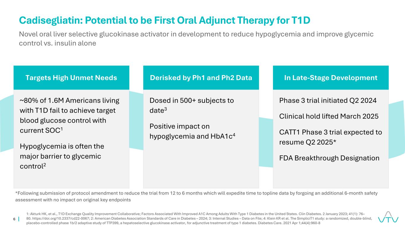 5 Cadisegliatin: Late-Stage Clinical Development Product Indication Pre-clinical Phase I Phase II Phase III* Next Key Milestone Partners + Regions Cadisegliatin (TTP399) GK Activator Type 1 Diabetes Topline Ph 3 data Partnership with G42 Healthcare to investigate cadisegliatin as an adjunct therapy to insulin for people living with Type 2 diabetes Cadisegliatin is under investigation and the safety and efficacy has not been established. There is no guarantee that this product will receive health authority approval or become commercially available for the use being investigated *Clinical hold lifted March 14, 2025; CATT1 Phase 3 trial expected to resume Q2 2025 following submission of protocol amendment to reduce the trial from 12 to 6 months which will expedite time to topline data by forgoing an additional 6-month safety assessment with no impact on original key endpoints
