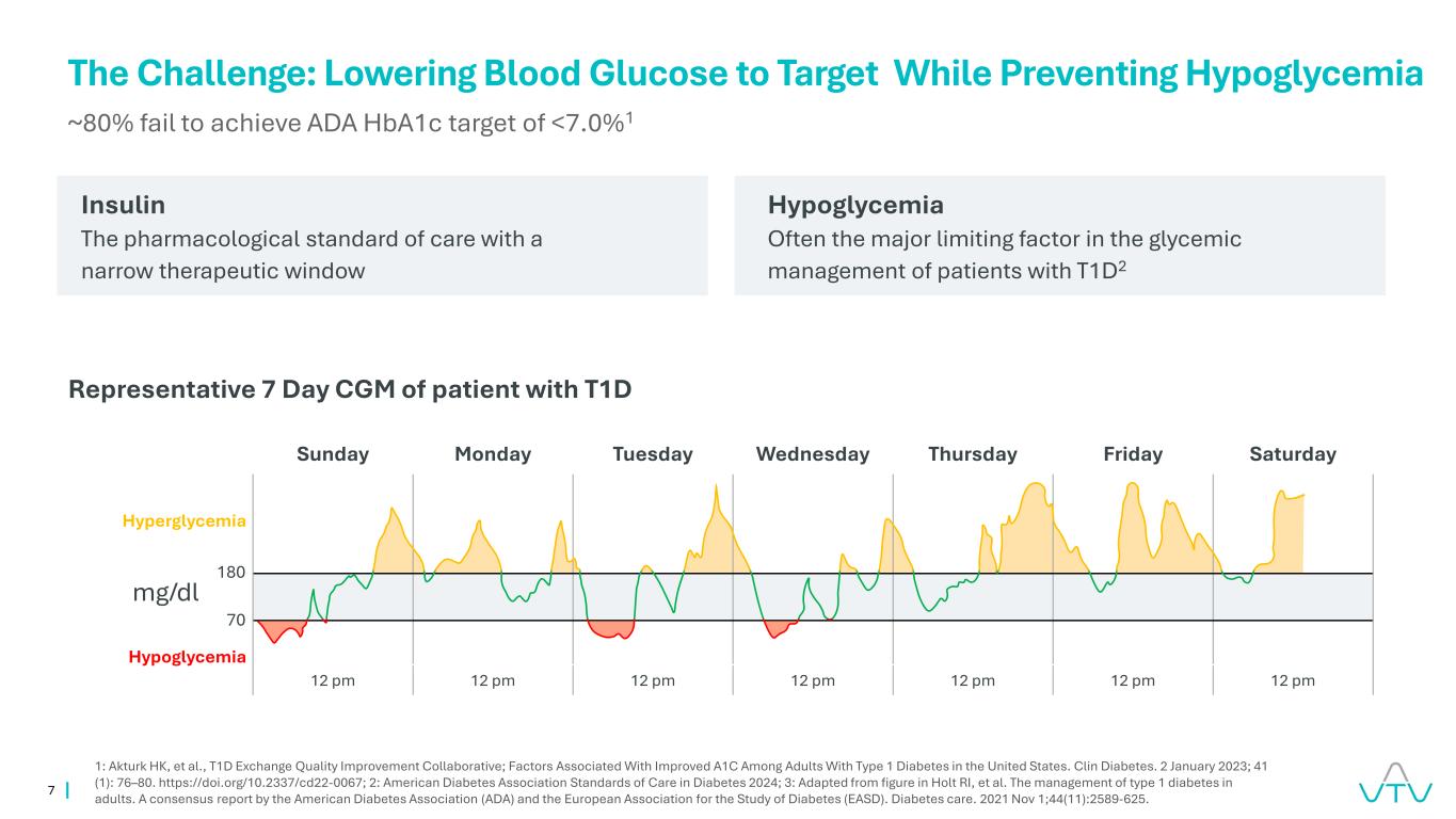 6 Cadisegliatin: Potential to be First Oral Adjunct Therapy for T1D Novel oral liver selective glucokinase activator in development to reduce hypoglycemia and improve glycemic control vs. insulin alone 1: Akturk HK, et al., T1D Exchange Quality Improvement Collaborative; Factors Associated With Improved A1C Among Adults With Type 1 Diabetes in the United States. Clin Diabetes. 2 January 2023; 41(1): 76– 80. https://doi.org/10.2337/cd22-0067; 2: American Diabetes Association Standards of Care in Diabetes – 2024; 3: Internal Studies – Data on File; 4: Klein KR et al. The SimpliciT1 study: a randomized, double-blind, placebo-controlled phase 1b/2 adaptive study of TTP399, a hepatoselective glucokinase activator, for adjunctive treatment of type 1 diabetes. Diabetes Care. 2021 Apr 1;44(4):960-8 ~80% of 1.6M Americans living with T1D fail to achieve target blood glucose control with current SOC1 Hypoglycemia is often the major barrier to glycemic control2 Dosed in 500+ subjects to date3 Positive impact on hypoglycemia and HbA1c4 Phase 3 trial initiated Q2 2024 Clinical hold lifted March 2025 CATT1 Phase 3 trial expected to resume Q2 2025* FDA Breakthrough Designation Targets High Unmet Needs Derisked by Ph1 and Ph2 Data In Late-Stage Development *Following submission of protocol amendment to reduce the trial from 12 to 6 months which will expedite time to topline data by forgoing an additional 6-month safety assessment with no impact on original key endpoints