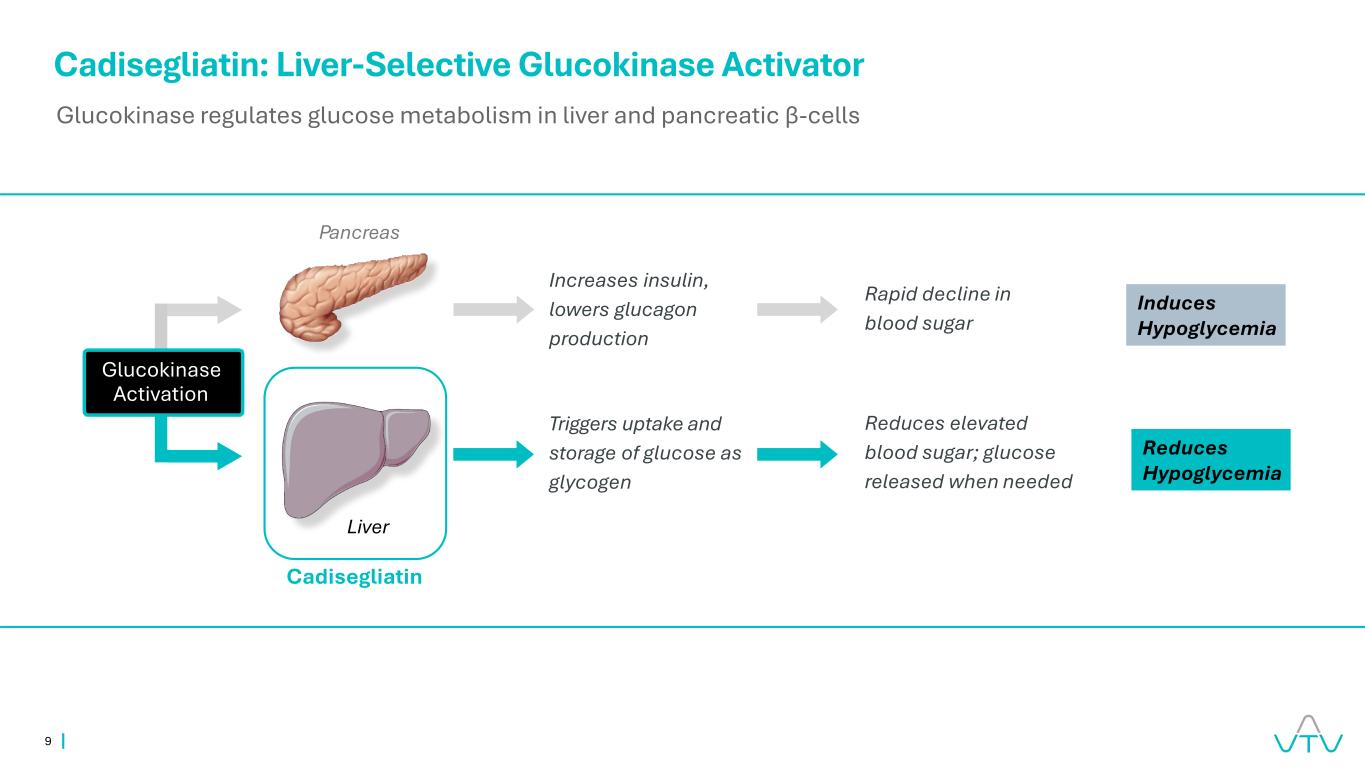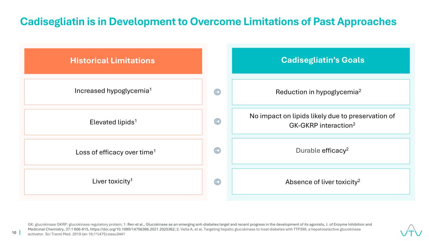 9 Cadisegliatin: Liver-Selective Glucokinase Activator Glucokinase regulates glucose metabolism in liver and pancreatic β-cells Pancreas Increases insulin, lowers glucagon production Triggers uptake and storage of glucose as glycogen Rapid decline in blood sugar Induces Hypoglycemia Reduces elevated blood sugar; glucose released when needed Glucokinase Activation Liver Reduces Hypoglycemia Cadisegliatin