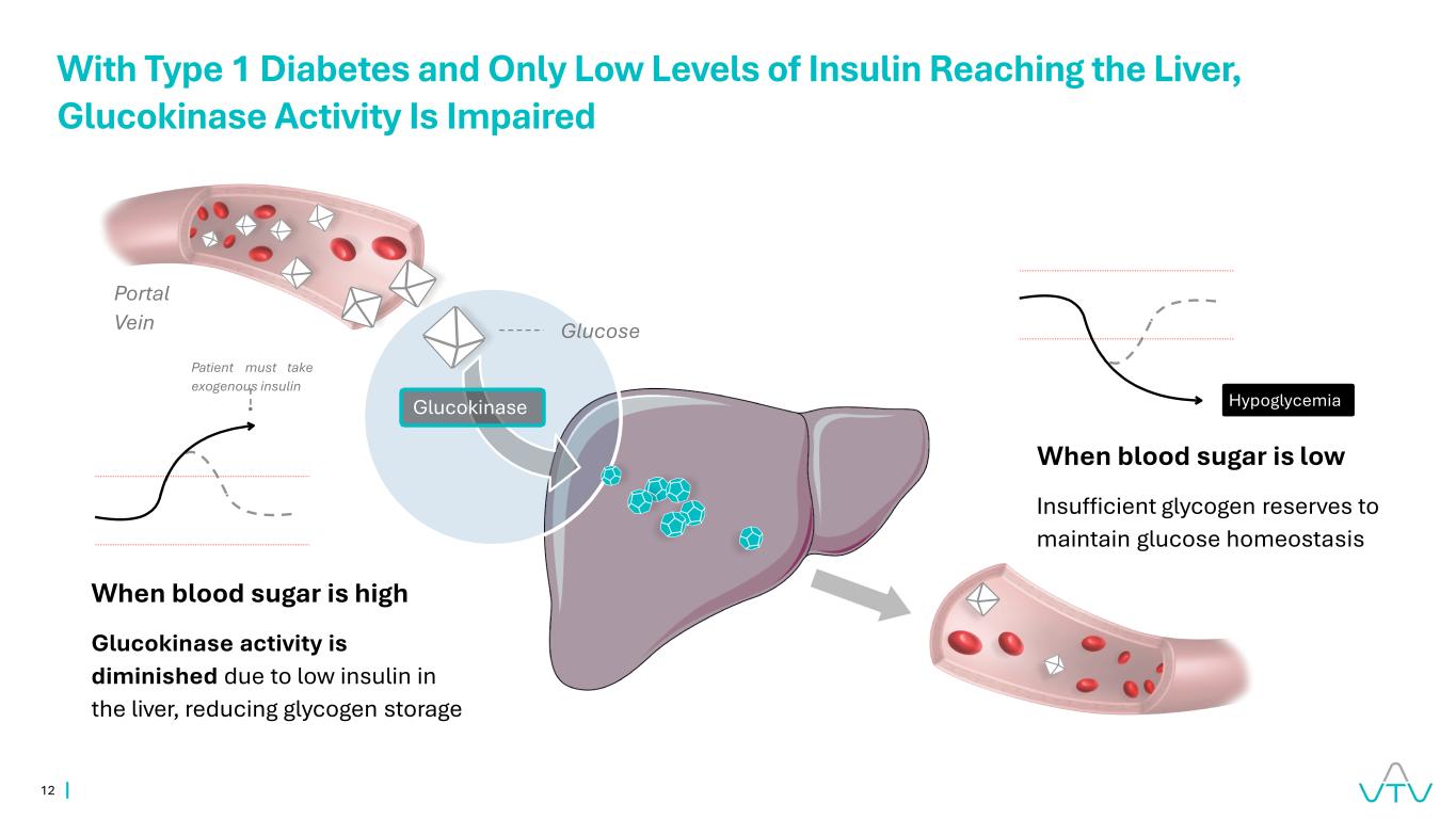 11 In Non-Diabetic People, the Liver Acts as a Reservoir for Glucose with Insulin and Glucokinase being Key Gatekeepers Glucokinase When blood sugar is high Glucokinase, in presence of insulin, converts glucose into glycogen for storage Insulin Glucose When blood sugar is low Glycogen reserves are broken down into glucose for release Glycogen Portal Vein