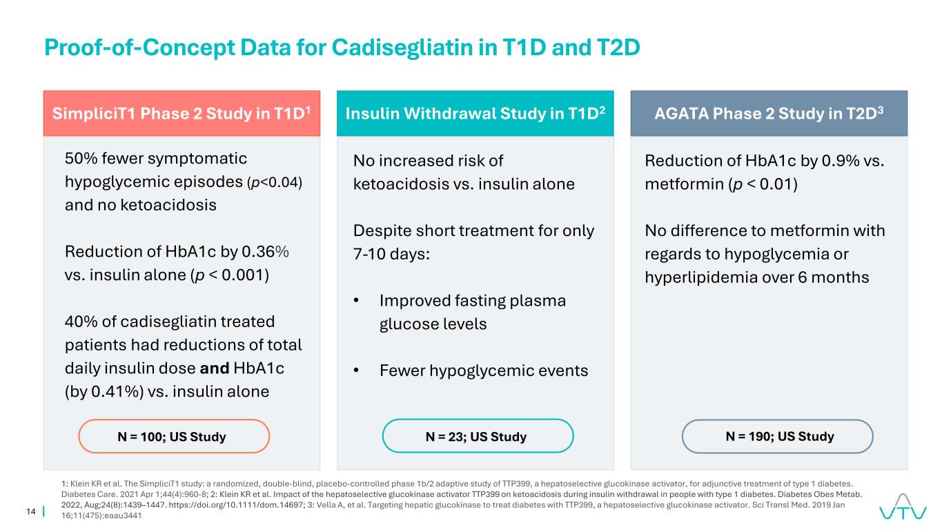 13 Cadisegliatin, as a Glucokinase Activator, Reactivates Innate Glucose- Regulating Capacity of the Liver Even in the Absence of Increased Insulin Levels When blood sugar is high Glucokinase is activated despite lower insulin levels When blood sugar is low Glycogen reserves available to prevent hypoglycemia Portal Vein cadisegliatin Glucokinase