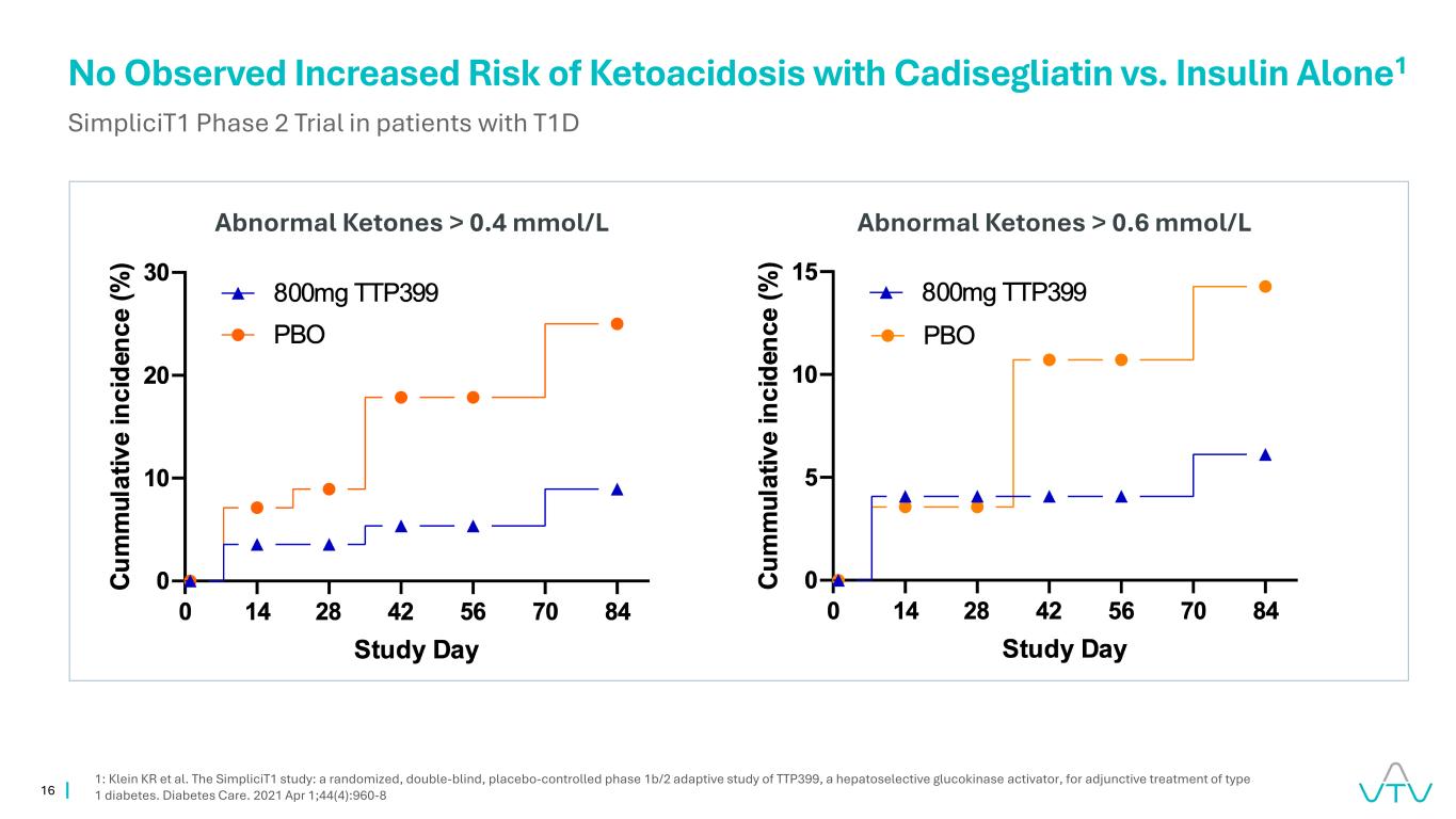 15 Randomized, Double-Blind, Placebo Controlled 2-Part Study of ~100 patients. A total of 49 patients in the treatment groups received 800mg daily of cadisegliatin. Fewer Hypoglycemic Events Cadisegliatin Significantly Reduced Hypoglycemia and HbA1c v. Insulin Alone1 SimpliciT1 Phase 2 Trial in patients with T1D 1: Klein KR et al. The SimpliciT1 study: a randomized, double-blind, placebo-controlled phase 1b/2 adaptive study of TTP399, a hepatoselective glucokinase activator, for adjunctive treatment of type 1 diabetes. Diabetes Care. 2021 Apr 1;44(4):960-8 Improved Glycemic Control