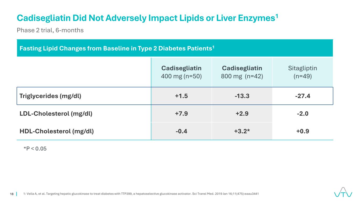 17 Cadisegliatin was Well-Tolerated Across People Living with T1D or T2D1,2 1: Vella A, et al. Targeting hepatic glucokinase to treat diabetes with TTP399, a hepatoselective glucokinase activator. Sci Transl Med. 2019 Jan 16;11(475):eaau3441. 2: Klein KR et al. The SimpliciT1 study: a randomized, double-blind, placebo-controlled phase 1b/2 adaptive study of TTP399, a hepatoselective glucokinase activator, for adjunctive treatment of type 1 diabetes. Diabetes Care. 2021 Apr 1;44(4):960-8 Type 1 Diabetes – Phase 2, 3-month trial Type 2 Diabetes – Phase 2, 6-month trial Cadisegliatin 800 mg (n=56) Placebo (n=49) Cadisegliatin 400 mg (n=50) Cadisegliatin 800 mg (n=42) Placebo (n=48) Sitagliptin (n=49) Treatment Emergent and Serious Adverse Events1,2 Subjects with ≥1 TEAE (%) 36 (64) 32 (65) 26 (52) 21 (50) 29 (60) 30 (61) Subjects with ≥1 related TEAE (%) 3 5 3 (6) 8 (19) 4 (8) 8 (16) SAEs 1 1 0 0 0 0 Subjects with ALT, AST, ALP > 1.5 UNL and/or bilirubin >2 ULN (%) 2 (4) 1 (2) 1(2) 0 0 0 Subjects with AST or ALT >3 ULN and bilirubin >1.5 ULN 0 0 0 0 0 0 DKA Events 0 0 N/A Subjects with ≥ 1 BOHB > 1mmol/l 1 (2) 3 (5)
