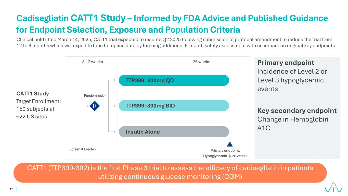 18 Cadisegliatin Did Not Adversely Impact Lipids or Liver Enzymes1 Phase 2 trial, 6-months 1: Vella A, et al. Targeting hepatic glucokinase to treat diabetes with TTP399, a hepatoselective glucokinase activator. Sci Transl Med. 2019 Jan 16;11(475):eaau3441 Fasting Lipid Changes from Baseline in Type 2 Diabetes Patients1 Cadisegliatin 400 mg (n=50) Cadisegliatin 800 mg (n=42) Sitagliptin (n=49) Triglycerides (mg/dl) +1.5 -13.3 -27.4 LDL-Cholesterol (mg/dl) +7.9 +2.9 -2.0 HDL-Cholesterol (mg/dl) -0.4 +3.2* +0.9 *P < 0.05