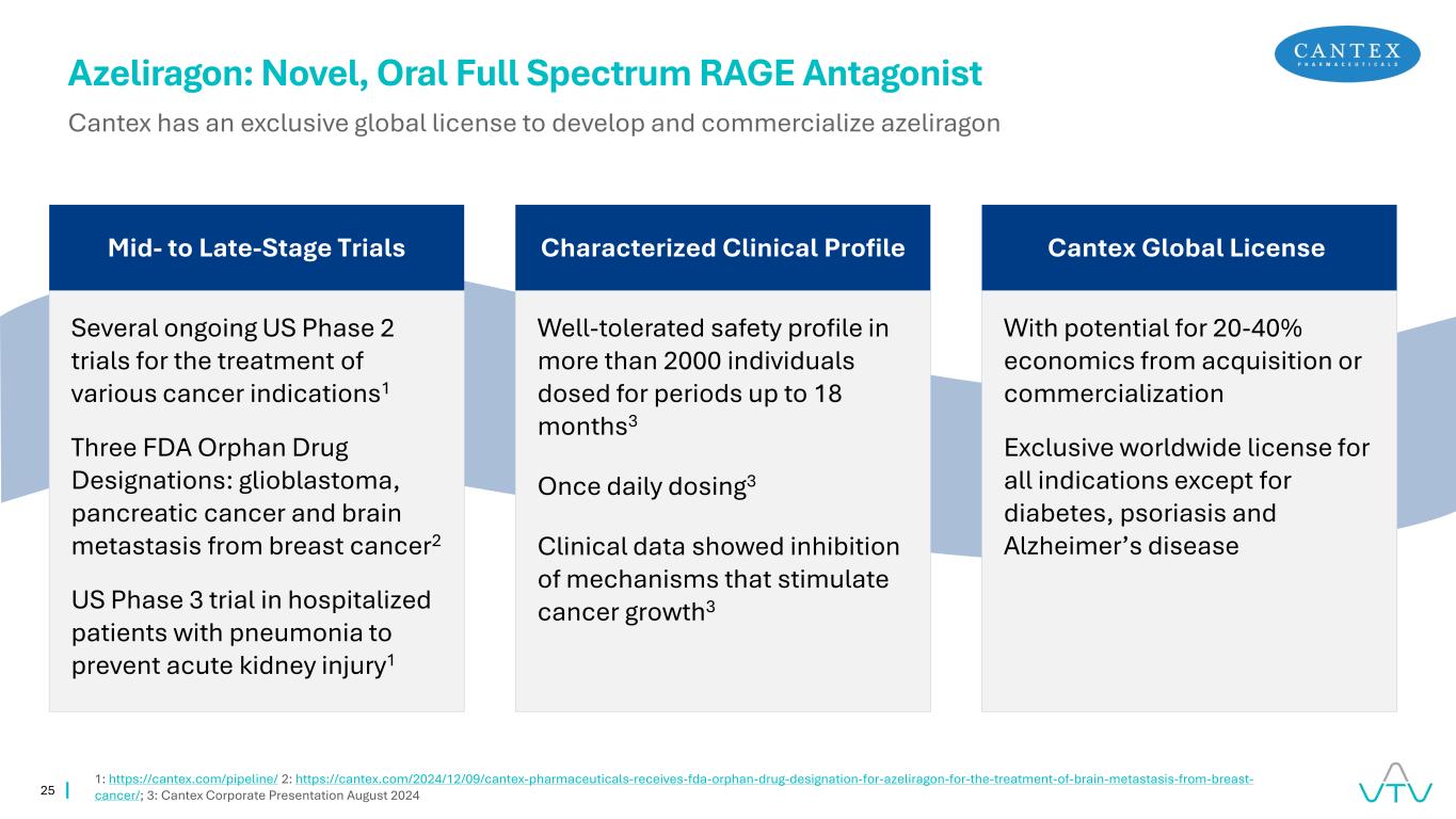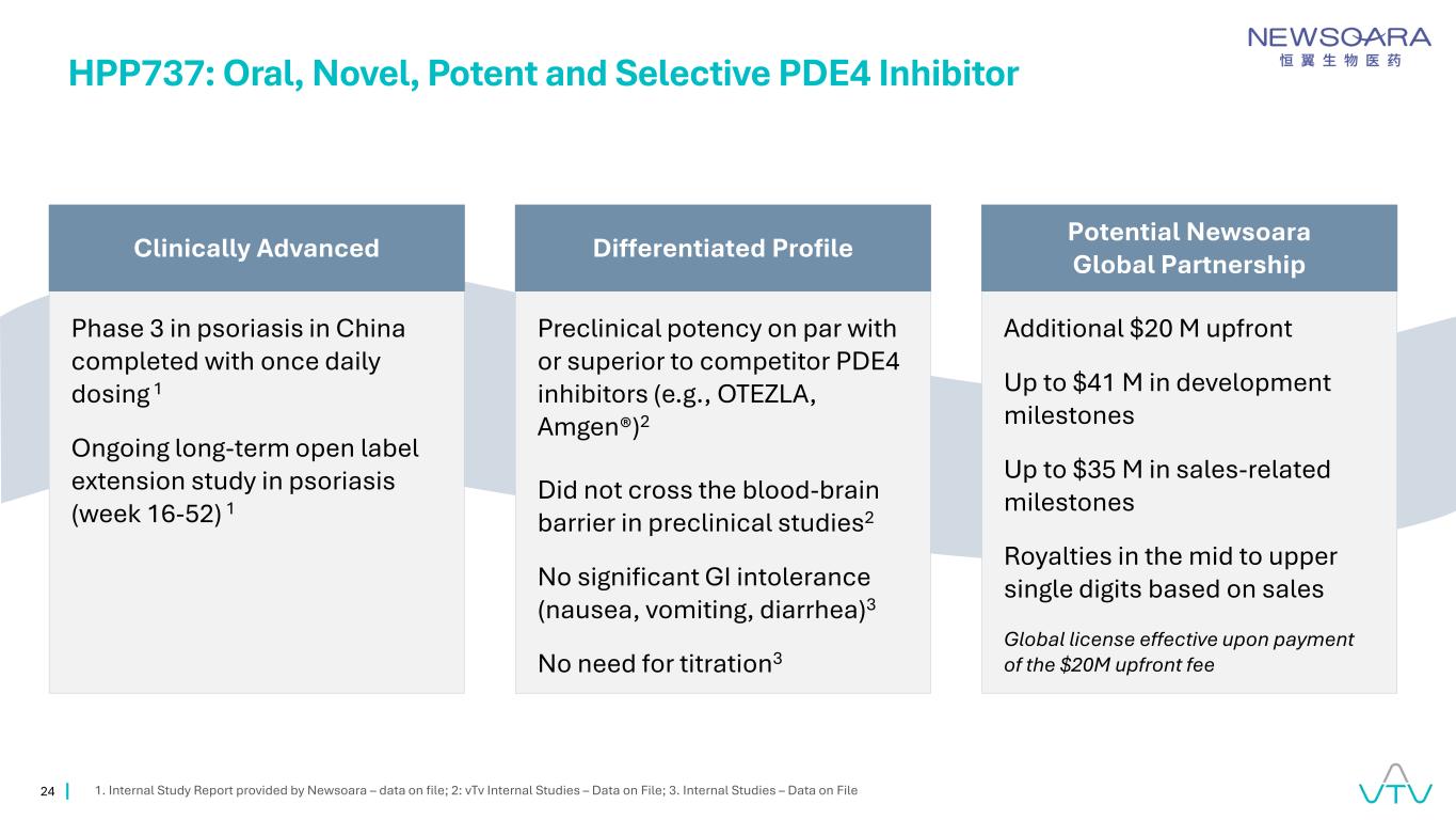 23 Cadisegliatin (TTP399) GK Activator HPP737 PDE4 Inhibitor Azeliragon RAGE Antagonist Type 2 Diabetes Phase 2 initiation 2025 Middle East Psoriasis*, COPD, Atopic Dermatitis Ongoing Phase 2 and Phase 3* trials China Pneumonia**, Glioblastoma, Breast Cancer, Pancreatic Cancer Ongoing Phase 2 and Phase 3** trials US Certain countries in the Middle East, Africa, and Central Asia China Global Royalties in high single digits Over $100 M potential value Potential for 20 - 40% of economics from commercialization or acquisition Partnerships Provide Potential Independent Revenue Streams