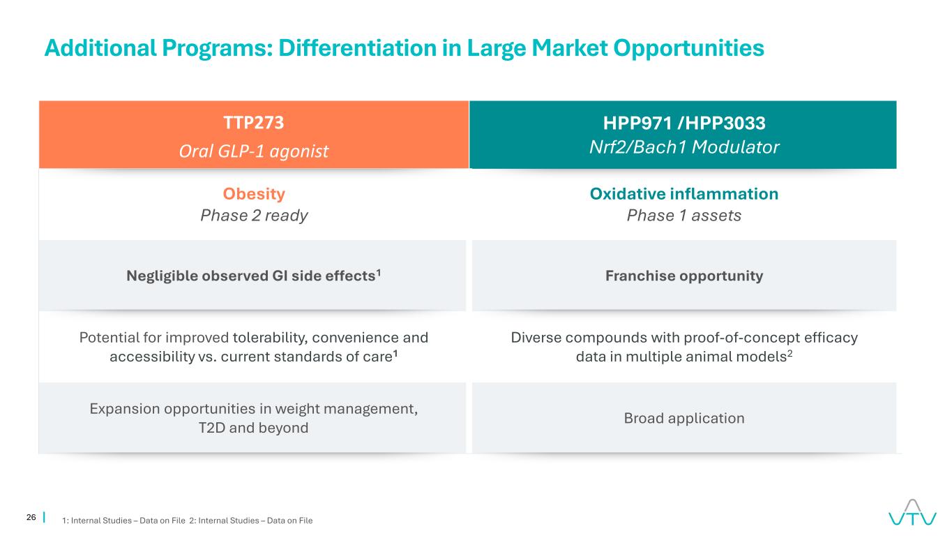 24 HPP737: Oral, Novel, Potent and Selective PDE4 Inhibitor 1. Internal Study Report provided by Newsoara – data on file; 2: vTv Internal Studies – Data on File; 3. Internal Studies – Data on File Phase 3 in psoriasis in China completed with once daily dosing 1 Ongoing long-term open label extension study in psoriasis (week 16-52) 1 Preclinical potency on par with or superior to competitor PDE4 inhibitors (e.g., OTEZLA, Amgen®)2 Did not cross the blood-brain barrier in preclinical studies2 No significant GI intolerance (nausea, vomiting, diarrhea)3 No need for titration3 Additional $20 M upfront Up to $41 M in development milestones Up to $35 M in sales-related milestones Royalties in the mid to upper single digits based on sales Global license effective upon payment of the $20M upfront fee Clinically Advanced Differentiated Profile Potential Newsoara Global Partnership