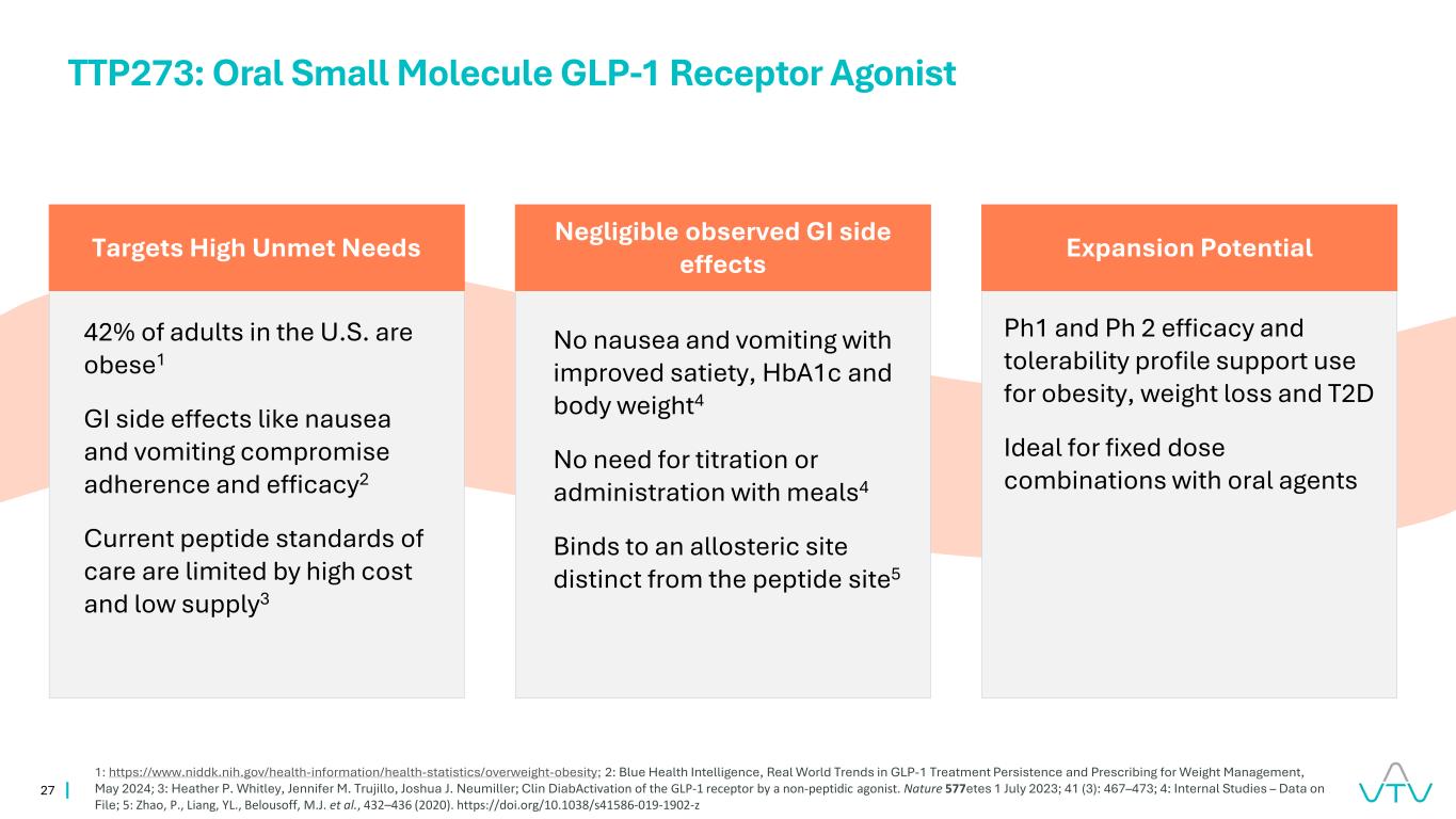 26 TTP273 Oral GLP-1 agonist HPP971 /HPP3033 Nrf2/Bach1 Modulator Obesity Phase 2 ready Oxidative inflammation Phase 1 assets Negligible observed GI side effects1 Franchise opportunity Potential for improved tolerability, convenience and accessibility vs. current standards of care1 Diverse compounds with proof-of-concept efficacy data in multiple animal models2 Expansion opportunities in weight management, T2D and beyond Broad application Additional Programs: Differentiation in Large Market Opportunities 1: Internal Studies – Data on File 2: Internal Studies – Data on File