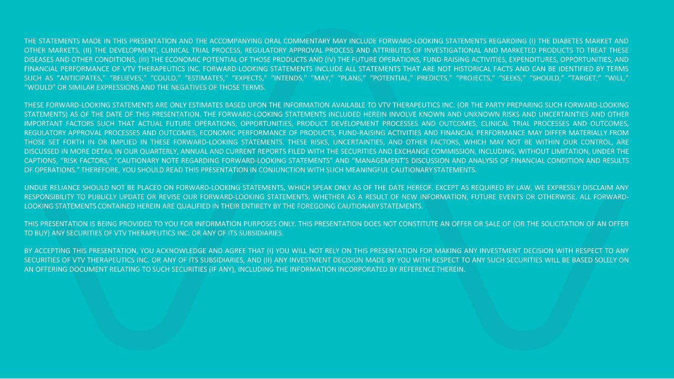 2 THE STATEMENTS MADE IN THIS PRESENTATION AND THE ACCOMPANYING ORAL COMMENTARY MAY INCLUDE FORWARD-LOOKING STATEMENTS REGARDING (I) THE DIABETES MARKET AND OTHER MARKETS, (II) THE DEVELOPMENT, CLINICAL TRIAL PROCESS, REGULATORY APPROVAL PROCESS AND ATTRIBUTES OF INVESTIGATIONAL AND MARKETED PRODUCTS TO TREAT THESE DISEASES AND OTHER CONDITIONS, (III) THE ECONOMIC POTENTIAL OF THOSE PRODUCTS AND (IV) THE FUTURE OPERATIONS, FUND-RAISING ACTIVITIES, EXPENDITURES, OPPORTUNITIES, AND FINANCIAL PERFORMANCE OF VTV THERAPEUTICS INC. FORWARD-LOOKING STATEMENTS INCLUDE ALL STATEMENTS THAT ARE NOT HISTORICAL FACTS AND CAN BE IDENTIFIED BY TERMS SUCH AS “ANTICIPATES,” “BELIEVES,” “COULD,” “ESTIMATES,” “EXPECTS,” “INTENDS,” “MAY,” “PLANS,” “POTENTIAL,” PREDICTS,” “PROJECTS,” “SEEKS,” “SHOULD,” “TARGET,” “WILL,” “WOULD” OR SIMILAR EXPRESSIONS AND THE NEGATIVES OF THOSE TERMS. THESE FORWARD-LOOKING STATEMENTS ARE ONLY ESTIMATES BASED UPON THE INFORMATION AVAILABLE TO VTV THERAPEUTICS INC. (OR THE PARTY PREPARING SUCH FORWARD-LOOKING STATEMENTS) AS OF THE DATE OF THIS PRESENTATION. THE FORWARD-LOOKING STATEMENTS INCLUDED HEREIN INVOLVE KNOWN AND UNKNOWN RISKS AND UNCERTAINTIES AND OTHER IMPORTANT FACTORS SUCH THAT ACTUAL FUTURE OPERATIONS, OPPORTUNITIES, PRODUCT DEVELOPMENT PROCESSES AND OUTCOMES, CLINICAL TRIAL PROCESSES AND OUTCOMES, REGULATORY APPROVAL PROCESSES AND OUTCOMES, ECONOMIC PERFORMANCE OF PRODUCTS, FUND-RAISING ACTIVITIES AND FINANCIAL PERFORMANCE MAY DIFFER MATERIALLY FROM THOSE SET FORTH IN OR IMPLIED IN THESE FORWARD-LOOKING STATEMENTS. THESE RISKS, UNCERTAINTIES, AND OTHER FACTORS, WHICH MAY NOT BE WITHIN OUR CONTROL, ARE DISCUSSED IN MORE DETAIL IN OUR QUARTERLY, ANNUAL AND CURRENT REPORTS FILED WITH THE SECURITIES AND EXCHANGE COMMISSION, INCLUDING, WITHOUT LIMITATION, UNDER THE CAPTIONS, “RISK FACTORS,” “CAUTIONARY NOTE REGARDING FORWARD-LOOKING STATEMENTS” AND “MANAGEMENT’S DISCUSSION AND ANALYSIS OF FINANCIAL CONDITION AND RESULTS OF OPERATIONS.” THEREFORE, YOU SHOULD READ THIS PRESENTATION IN CONJUNCTION WITH SUCH MEANINGFUL CAUTIONARY STATEMENTS. UNDUE RELIANCE SHOULD NOT BE PLACED ON FORWARD-LOOKING STATEMENTS, WHICH SPEAK ONLY AS OF THE DATE HEREOF. EXCEPT AS REQUIRED BY LAW, WE EXPRESSLY DISCLAIM ANY RESPONSIBILITY TO PUBLICLY UPDATE OR REVISE OUR FORWARD-LOOKING STATEMENTS, WHETHER AS A RESULT OF NEW INFORMATION, FUTURE EVENTS OR OTHERWISE. ALL FORWARD- LOOKING STATEMENTS CONTAINED HEREIN ARE QUALIFIED IN THEIR ENTIRETY BY THE FOREGOING CAUTIONARYSTATEMENTS. THIS PRESENTATION IS BEING PROVIDED TO YOU FOR INFORMATION PURPOSES ONLY. THIS PRESENTATION DOES NOT CONSTITUTE AN OFFER OR SALE OF (OR THE SOLICITATION OF AN OFFER TO BUY) ANY SECURITIES OF VTV THERAPEUTICS INC. OR ANY OF ITS SUBSIDIARIES. BY ACCEPTING THIS PRESENTATION, YOU ACKNOWLEDGE AND AGREE THAT (I) YOU WILL NOT RELY ON THIS PRESENTATION FOR MAKING ANY INVESTMENT DECISION WITH RESPECT TO ANY SECURITIES OF VTV THERAPEUTICS INC. OR ANY OF ITS SUBSIDIARIES, AND (II) ANY INVESTMENT DECISION MADE BY YOU WITH RESPECT TO ANY SUCH SECURITIES WILL BE BASED SOLELY ON AN OFFERING DOCUMENT RELATING TO SUCH SECURITIES (IF ANY), INCLUDING THE INFORMATION INCORPORATED BY REFERENCETHEREIN.