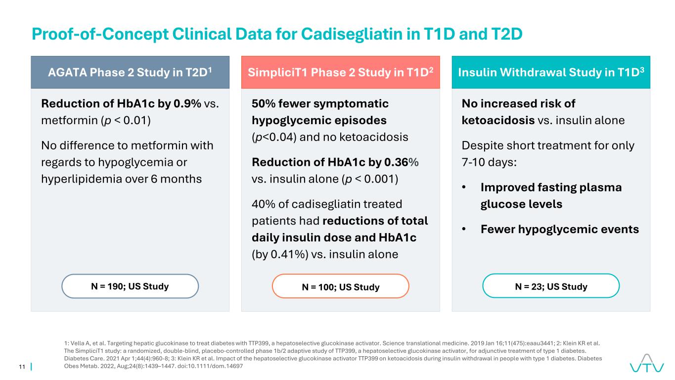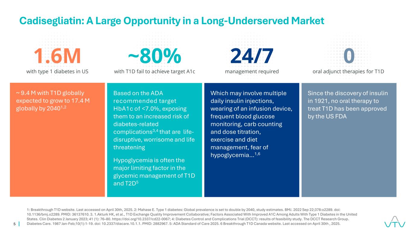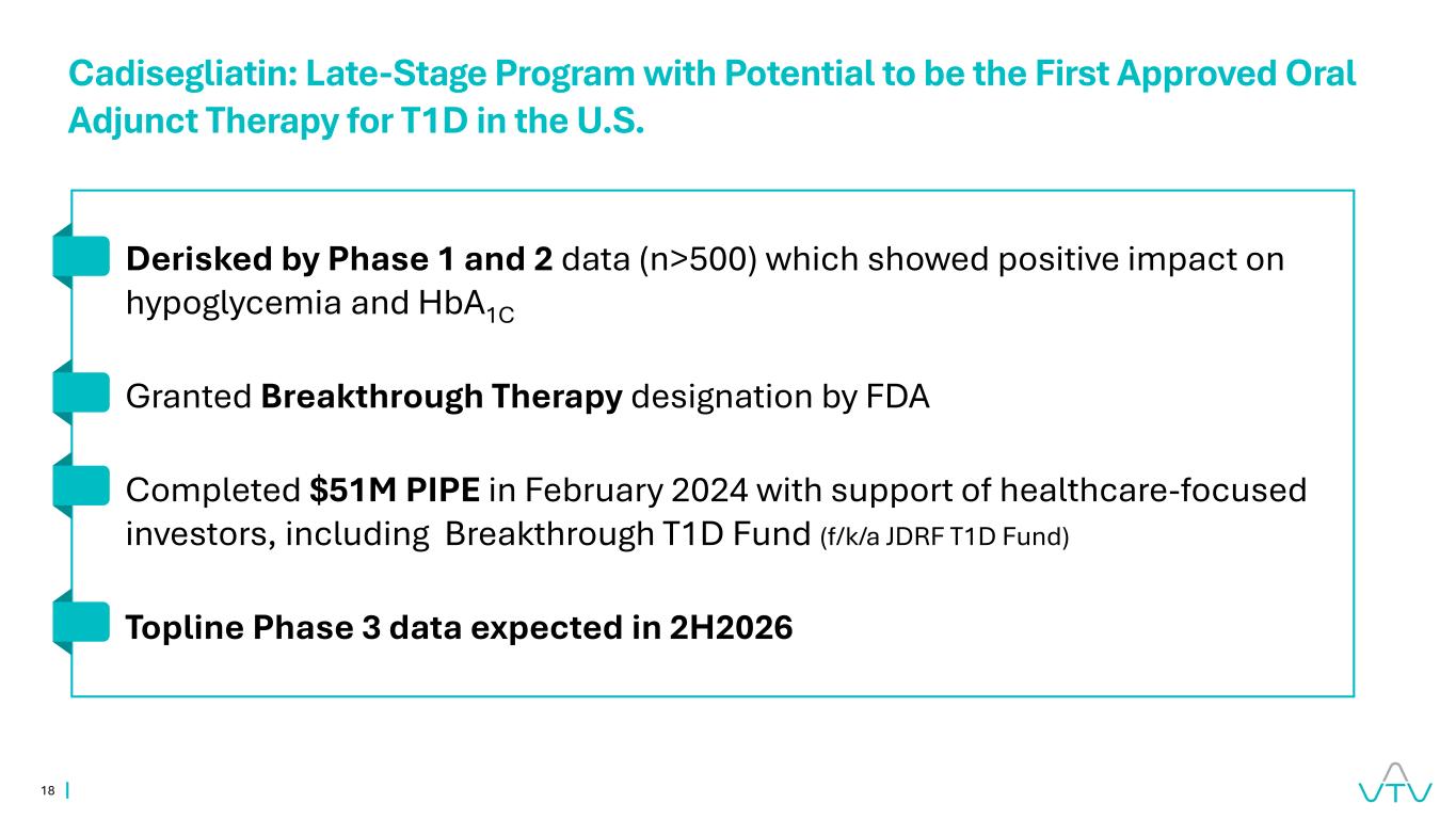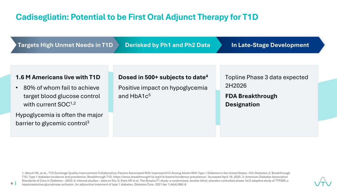 5 Which may involve multiple daily insulin injections, wearing of an infusion device, frequent blood glucose monitoring, carb counting and dose titration, exercise and diet management, fear of hypoglycemia…1,6 ~ 9.4 M with T1D globally expected to grow to 17.4 M globally by 20401,2 Based on the ADA recommended target HbA1c of <7.0%, exposing them to an increased risk of diabetes-related complications3,4 that are life- disruptive, worrisome and life threatening Hypoglycemia is often the major limiting factor in the glycemic management of T1D and T2D5 Since the discovery of insulin in 1921, no oral therapy to treat T1D has been approved by the US FDA 1.6M with type 1 diabetes in US ~80% with T1D fail to achieve target A1c 0 oral adjunct therapies for T1D 24/7 management required Cadisegliatin: A Large Opportunity in a Long-Underserved Market 1: Breakthrough T1D website. Last accessed on April 30th, 2025. 2: Mahase E. Type 1 diabetes: Global prevalence is set to double by 2040, study estimates. BMJ. 2022 Sep 22;378:o2289. doi: 10.1136/bmj.o2289. PMID: 36137610. 3. 1.Akturk HK, et al., T1D Exchange Quality Improvement Collaborative; Factors Associated With Improved A1C Among Adults With Type 1 Diabetes in the United States. Clin Diabetes 2 January 2023; 41 (1): 76–80. https://doi.org/10.2337/cd22-0067; 4: Diabetes Control and Complications Trial (DCCT): results of feasibility study. The DCCT Research Group. Diabetes Care. 1987 Jan-Feb;10(1):1-19. doi: 10.2337/diacare.10.1.1. PMID: 2882967. 5: ADA Standard of Care 2025. 6 Breakthrough T1D Canada website. Last accessed on April 30th , 2025.