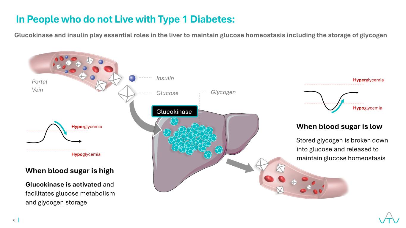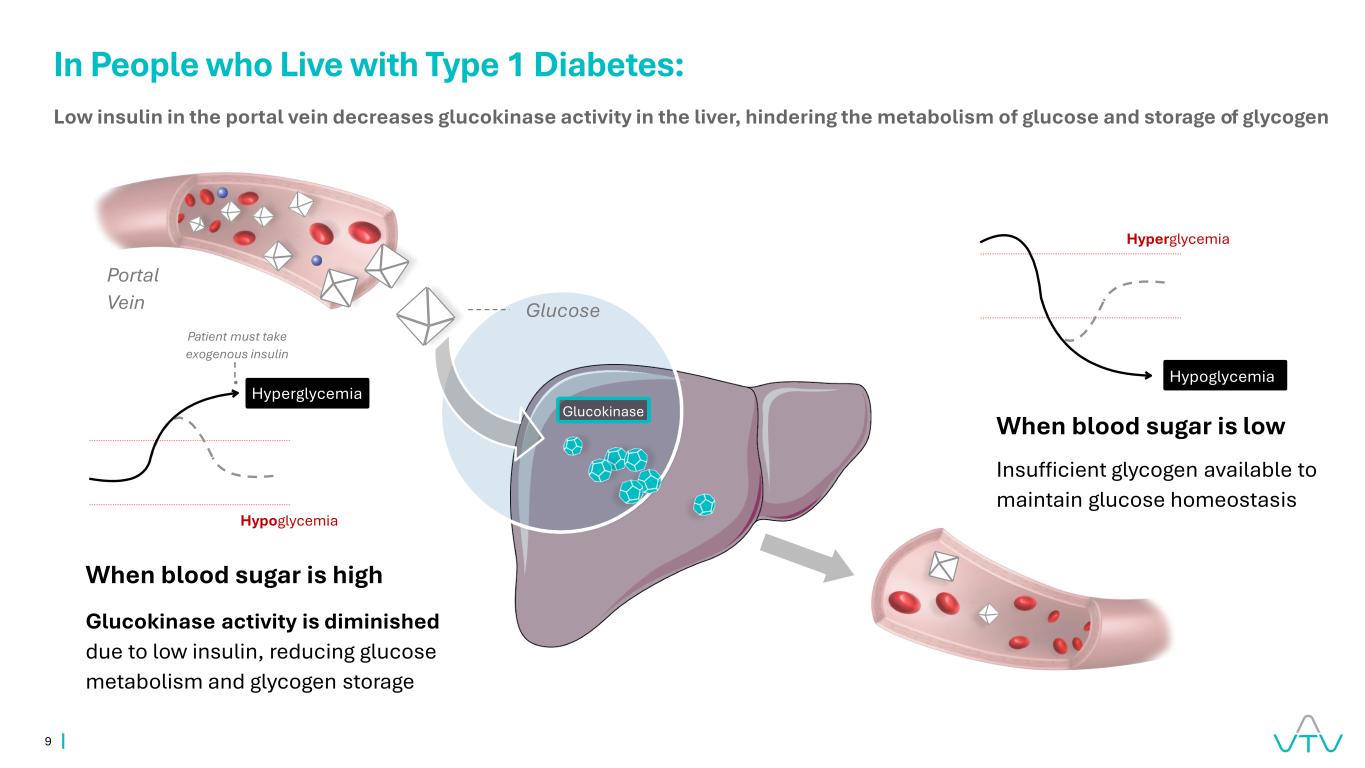 8 When blood sugar is low Stored glycogen is broken down into glucose and released to maintain glucose homeostasis Glucokinase Insulin Glucose Glycogen Portal Vein In People who do not Live with Type 1 Diabetes: Glucokinase and insulin play essential roles in the liver to maintain glucose homeostasis including the storage of glycogen Hyperglycemia Hypoglycemia Hyperglycemia Hypoglycemia When blood sugar is high Glucokinase is activated and facilitates glucose metabolism and glycogen storage