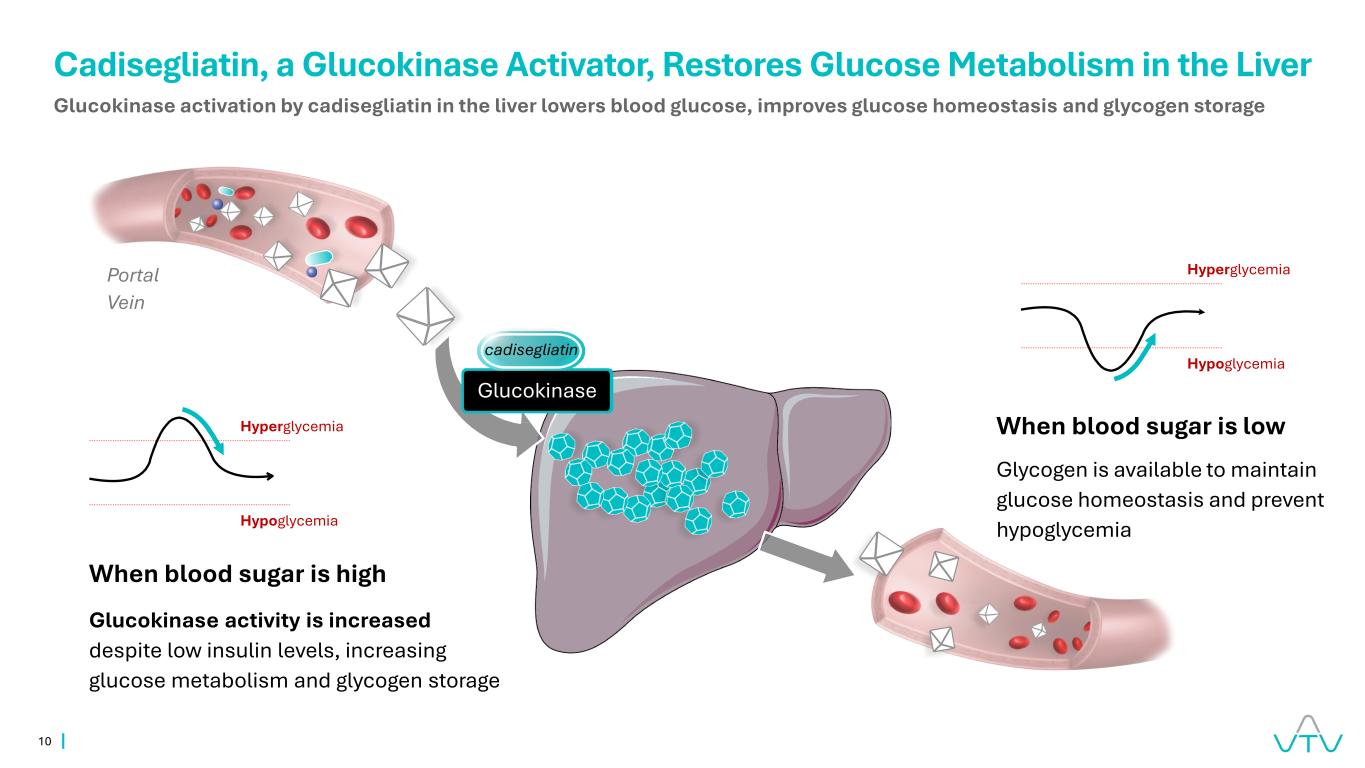 9 When blood sugar is high Glucokinase activity is diminished due to low insulin, reducing glucose metabolism and glycogen storage Hypoglycemia Patient must take exogenous insulin Glucose Portal Vein Low insulin in the portal vein decreases glucokinase activity in the liver, hindering the metabolism of glucose and storage of glycogen Hyperglycemia Hypoglycemia Hyperglycemia Glucokinase In People who Live with Type 1 Diabetes: When blood sugar is low Insufficient glycogen available to maintain glucose homeostasis