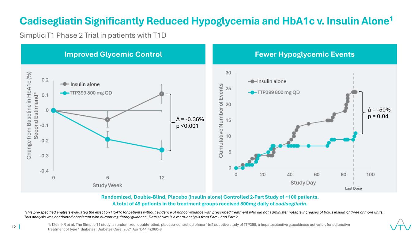 11 AGATA Phase 2 Study in T2D1 Reduction of HbA1c by 0.9% vs. metformin (p < 0.01) No difference to metformin with regards to hypoglycemia or hyperlipidemia over 6 months N = 190; US Study Proof-of-Concept Clinical Data for Cadisegliatin in T1D and T2D 1: Vella A, et al. Targeting hepatic glucokinase to treat diabetes with TTP399, a hepatoselective glucokinase activator. Science translational medicine. 2019 Jan 16;11(475):eaau3441; 2: Klein KR et al. The SimpliciT1 study: a randomized, double-blind, placebo-controlled phase 1b/2 adaptive study of TTP399, a hepatoselective glucokinase activator, for adjunctive treatment of type 1 diabetes. Diabetes Care. 2021 Apr 1;44(4):960-8; 3: Klein KR et al. Impact of the hepatoselective glucokinase activator TTP399 on ketoacidosis during insulin withdrawal in people with type 1 diabetes. Diabetes Obes Metab. 2022, Aug;24(8):1439–1447. doi:10.1111/dom.14697 Insulin Withdrawal Study in T1D3 No increased risk of ketoacidosis vs. insulin alone Despite short treatment for only 7-10 days: • Improved fasting plasma glucose levels • Fewer hypoglycemic events N = 23; US Study SimpliciT1 Phase 2 Study in T1D2 50% fewer symptomatic hypoglycemic episodes (p<0.04) and no ketoacidosis Reduction of HbA1c by 0.36% vs. insulin alone (p < 0.001) 40% of cadisegliatin treated patients had reductions of total daily insulin dose and HbA1c (by 0.41%) vs. insulin alone N = 100; US Study