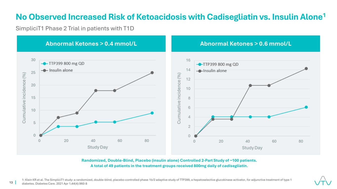 12 Randomized, Double-Blind, Placebo (insulin alone) Controlled 2-Part Study of ~100 patients. A total of 49 patients in the treatment groups received 800mg daily of cadisegliatin. Cadisegliatin Significantly Reduced Hypoglycemia and HbA1c v. Insulin Alone1 SimpliciT1 Phase 2 Trial in patients with T1D 1: Klein KR et al. The SimpliciT1 study: a randomized, double-blind, placebo-controlled phase 1b/2 adaptive study of TTP399, a hepatoselective glucokinase activator, for adjunctive treatment of type 1 diabetes. Diabetes Care. 2021 Apr 1;44(4):960-8 Improved Glycemic Control Fewer Hypoglycemic Events Δ = -0.36% p <0.001 *This pre-specified analysis evaluated the effect on HbA1c for patients without evidence of noncompliance with prescribed treatment who did not administer notable increases of bolus insulin of three or more units. This analysis was conducted consistent with current regulatory guidance. Data shown is a meta-analysis from Part 1 and Part 2. Δ = -50% p = 0.04 Last Dose