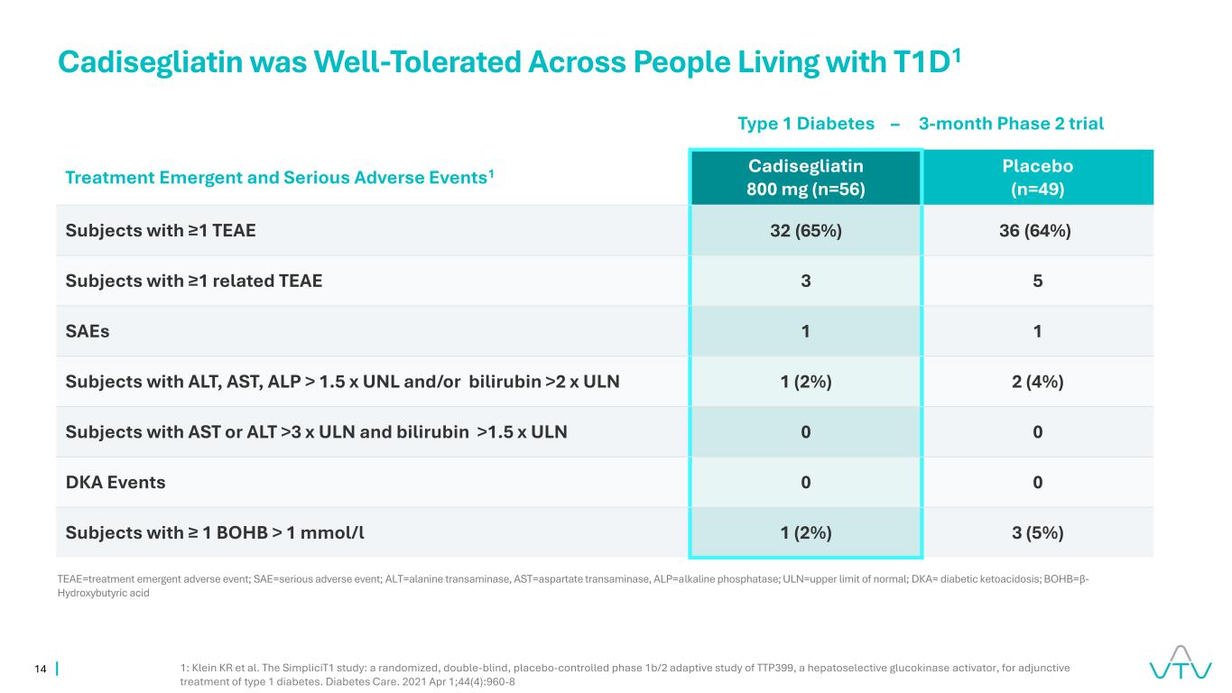 13 No Observed Increased Risk of Ketoacidosis with Cadisegliatin vs. Insulin Alone1 SimpliciT1 Phase 2 Trial in patients with T1D Abnormal Ketones > 0.4 mmol/L Abnormal Ketones > 0.6 mmol/L 1: Klein KR et al. The SimpliciT1 study: a randomized, double-blind, placebo-controlled phase 1b/2 adaptive study of TTP399, a hepatoselective glucokinase activator, for adjunctive treatment of type 1 diabetes. Diabetes Care. 2021 Apr 1;44(4):960-8 Randomized, Double-Blind, Placebo (insulin alone) Controlled 2-Part Study of ~100 patients. A total of 49 patients in the treatment groups received 800mg daily of cadisegliatin.