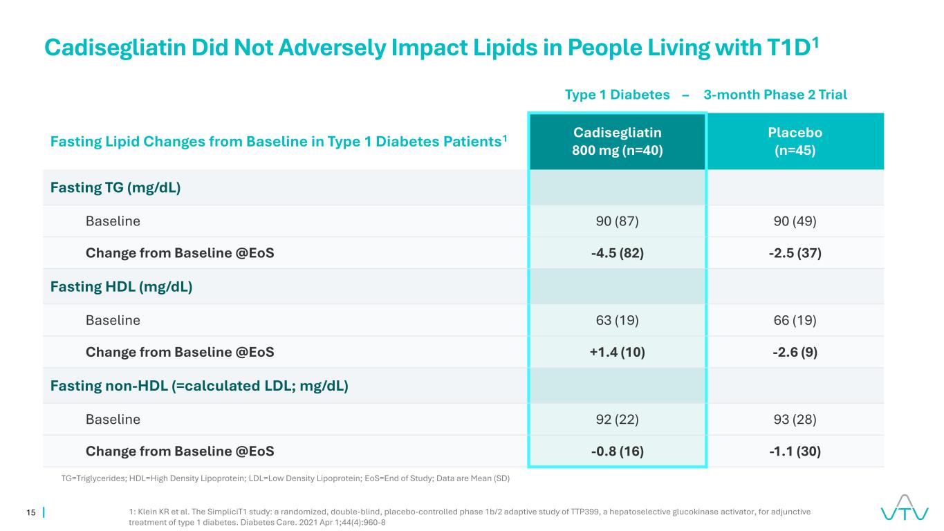 14 Cadisegliatin was Well-Tolerated Across People Living with T1D1 1: Klein KR et al. The SimpliciT1 study: a randomized, double-blind, placebo-controlled phase 1b/2 adaptive study of TTP399, a hepatoselective glucokinase activator, for adjunctive treatment of type 1 diabetes. Diabetes Care. 2021 Apr 1;44(4):960-8 Treatment Emergent and Serious Adverse Events1 Cadisegliatin 800 mg (n=56) Placebo (n=49) Subjects with ≥1 TEAE 32 (65%) 36 (64%) Subjects with ≥1 related TEAE 3 5 SAEs 1 1 Subjects with ALT, AST, ALP > 1.5 x UNL and/or bilirubin >2 x ULN 1 (2%) 2 (4%) Subjects with AST or ALT >3 x ULN and bilirubin >1.5 x ULN 0 0 DKA Events 0 0 Subjects with ≥ 1 BOHB > 1 mmol/l 1 (2%) 3 (5%) TEAE=treatment emergent adverse event; SAE=serious adverse event; ALT=alanine transaminase, AST=aspartate transaminase, ALP=alkaline phosphatase; ULN=upper limit of normal; DKA= diabetic ketoacidosis; BOHB=β- Hydroxybutyric acid Type 1 Diabetes – 3-month Phase 2 trial