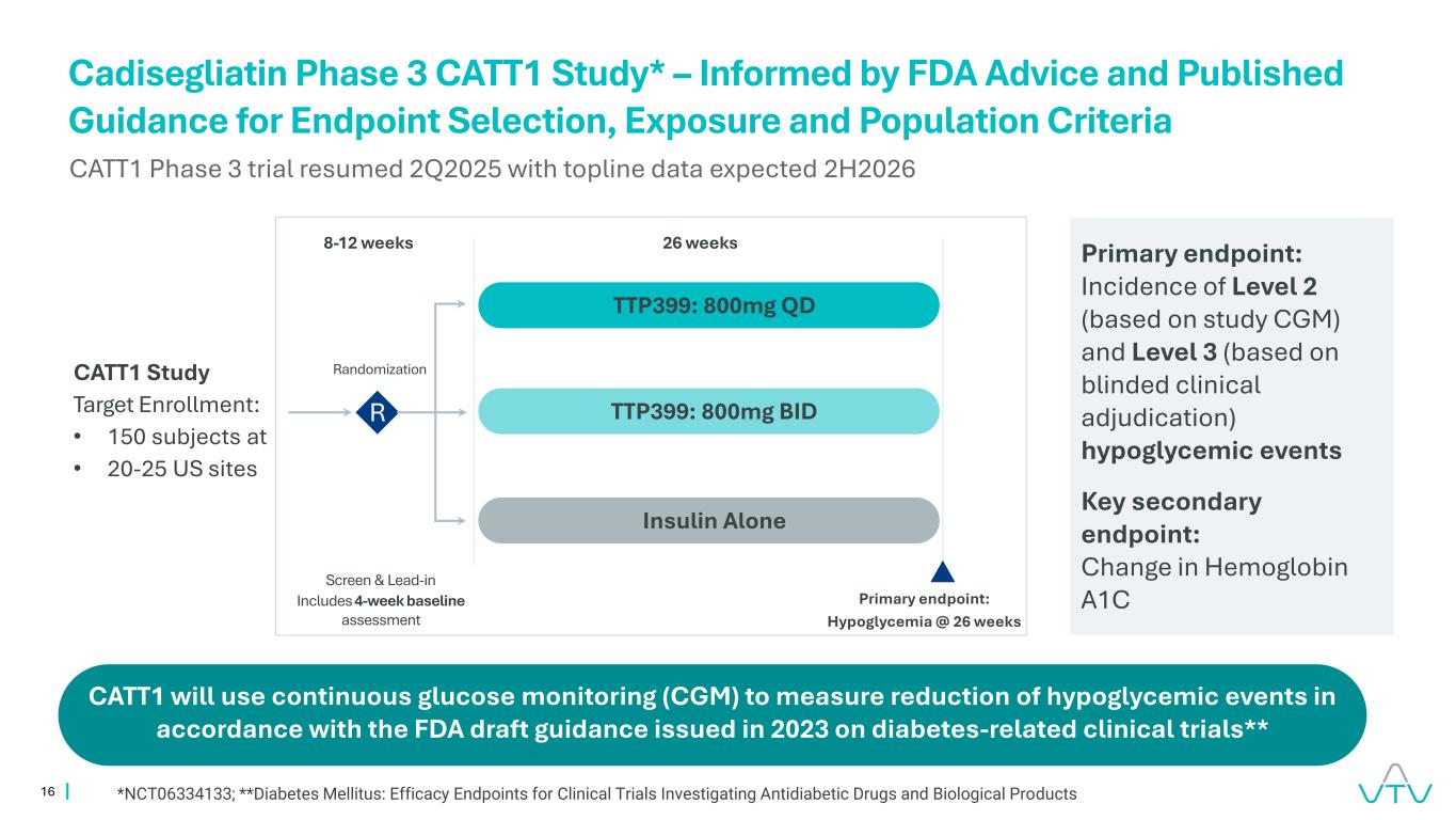 15 Cadisegliatin Did Not Adversely Impact Lipids in People Living with T1D1 Fasting Lipid Changes from Baseline in Type 1 Diabetes Patients1 Cadisegliatin 800 mg (n=40) Placebo (n=45) Fasting TG (mg/dL) Baseline 90 (87) 90 (49) Change from Baseline @EoS -4.5 (82) -2.5 (37) Fasting HDL (mg/dL) Baseline 63 (19) 66 (19) Change from Baseline @EoS +1.4 (10) -2.6 (9) Fasting non-HDL (=calculated LDL; mg/dL) Baseline 92 (22) 93 (28) Change from Baseline @EoS -0.8 (16) -1.1 (30) Type 1 Diabetes – 3-month Phase 2 Trial 1: Klein KR et al. The SimpliciT1 study: a randomized, double-blind, placebo-controlled phase 1b/2 adaptive study of TTP399, a hepatoselective glucokinase activator, for adjunctive treatment of type 1 diabetes. Diabetes Care. 2021 Apr 1;44(4):960-8 TG=Triglycerides; HDL=High Density Lipoprotein; LDL=Low Density Lipoprotein; EoS=End of Study; Data are Mean (SD)
