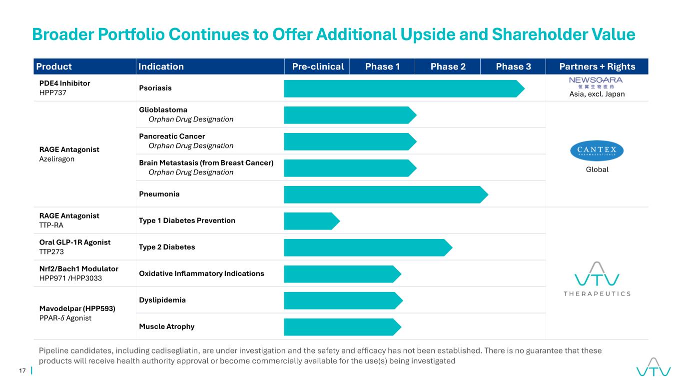 16 Cadisegliatin Phase 3 CATT1 Study* – Informed by FDA Advice and Published Guidance for Endpoint Selection, Exposure and Population Criteria CATT1 Study Target Enrollment: • 150 subjects at • 20-25 US sites Primary endpoint: Incidence of Level 2 (based on study CGM) and Level 3 (based on blinded clinical adjudication) hypoglycemic events Key secondary endpoint: Change in Hemoglobin A1C Screen & Lead-in Includes 4-week baseline assessment Randomization R Primary endpoint: Hypoglycemia @ 26 weeks TTP399: 800mg QD TTP399: 800mg BID Insulin Alone 26 weeks8-12 weeks CATT1 Phase 3 trial resumed 2Q2025 with topline data expected 2H2026 CATT1 will use continuous glucose monitoring (CGM) to measure reduction of hypoglycemic events in accordance with the FDA draft guidance issued in 2023 on diabetes-related clinical trials** *NCT06334133; **Diabetes Mellitus: Efficacy Endpoints for Clinical Trials Investigating Antidiabetic Drugs and Biological Products