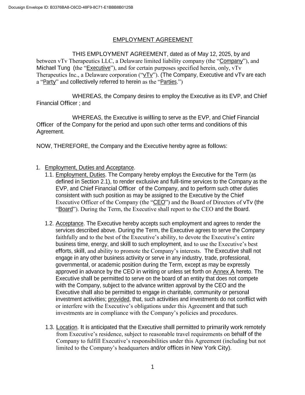 1 EMPLOYMENT AGREEMENT THIS EMPLOYMENT AGREEMENT, dated as of May 12, 2025, by and between vTv Therapeutics LLC, a Delaware limited liability company (the “Company”), and Michael Tung (the “Executive”), and for certain purposes specified herein, only, vTv Therapeutics Inc., a Delaware corporation (“vTv”). (The Company, Executive and vTv are each a “Party” and collectively referred to herein as the “Parties.”) WHEREAS, the Company desires to employ the Executive as its EVP, and Chief Financial Officer ; and WHEREAS, the Executive is willing to serve as the EVP, and Chief Financial Officer of the Company for the period and upon such other terms and conditions of this Agreement. NOW, THEREFORE, the Company and the Executive hereby agree as follows: 1. Employment, Duties and Acceptance. 1.1. Employment, Duties. The Company hereby employs the Executive for the Term (as defined in Section 2.1), to render exclusive and full-time services to the Company as the EVP, and Chief Financial Officer of the Company, and to perform such other duties consistent with such position as may be assigned to the Executive by the Chief Executive Officer of the Company (the “CEO”) and the Board of Directors of vTv (the “Board”). During the Term, the Executive shall report to the CEO and the Board. 1.2. Acceptance. The Executive hereby accepts such employment and agrees to render the services described above. During the Term, the Executive agrees to serve the Company faithfully and to the best of the Executive’s ability, to devote the Executive’s entire business time, energy, and skill to such employment, and to use the Executive’s best efforts, skill, and ability to promote the Company’s interests. The Executive shall not engage in any other business activity or serve in any industry, trade, professional, governmental, or academic position during the Term, except as may be expressly approved in advance by the CEO in writing or unless set forth on Annex A hereto. The Executive shall be permitted to serve on the board of an entity that does not compete with the Company, subject to the advance written approval by the CEO and the Executive shall also be permitted to engage in charitable, community or personal investment activities; provided, that, such activities and investments do not conflict with or interfere with the Executive’s obligations under this Agreement and that such investments are in compliance with the Company’s policies and procedures. 1.3. Location. It is anticipated that the Executive shall permitted to primarily work remotely from Executive’s residence, subject to reasonable travel requirements on behalf of the Company to fulfill Executive’s responsibilities under this Agreement (including but not limited to the Company’s headquarters and/or offices in New York City). Docusign Envelope ID: B3376BA8-C6CD-48F9-8C71-E1BBB8B0125B