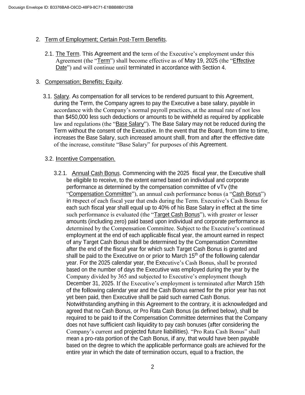 2 2. Term of Employment; Certain Post-Term Benefits. 2.1. The Term. This Agreement and the term of the Executive’s employment under this Agreement (the “Term”) shall become effective as of May 19, 2025 (the “Effective Date”) and will continue until terminated in accordance with Section 4. 3. Compensation; Benefits; Equity. 3.1. Salary. As compensation for all services to be rendered pursuant to this Agreement, during the Term, the Company agrees to pay the Executive a base salary, payable in accordance with the Company’s normal payroll practices, at the annual rate of not less than $450,000 less such deductions or amounts to be withheld as required by applicable law and regulations (the “Base Salary”). The Base Salary may not be reduced during the Term without the consent of the Executive. In the event that the Board, from time to time, increases the Base Salary, such increased amount shall, from and after the effective date of the increase, constitute “Base Salary” for purposes of this Agreement. 3.2. Incentive Compensation. 3.2.1. Annual Cash Bonus. Commencing with the 2025 fiscal year, the Executive shall be eligible to receive, to the extent earned based on individual and corporate performance as determined by the compensation committee of vTv (the “Compensation Committee”), an annual cash performance bonus (a “Cash Bonus”) in respect of each fiscal year that ends during the Term. Executive’s Cash Bonus for each such fiscal year shall equal up to 40% of his Base Salary in effect at the time such performance is evaluated (the “Target Cash Bonus”), with greater or lesser amounts (including zero) paid based upon individual and corporate performance as determined by the Compensation Committee. Subject to the Executive’s continued employment at the end of each applicable fiscal year, the amount earned in respect of any Target Cash Bonus shall be determined by the Compensation Committee after the end of the fiscal year for which such Target Cash Bonus is granted and shall be paid to the Executive on or prior to March 15th of the following calendar year. For the 2025 calendar year, the Executive’s Cash Bonus, shall be prorated based on the number of days the Executive was employed during the year by the Company divided by 365 and subjected to Executive’s employment though December 31, 2025. If the Executive’s employment is terminated after March 15th of the following calendar year and the Cash Bonus earned for the prior year has not yet been paid, then Executive shall be paid such earned Cash Bonus. Notwithstanding anything in this Agreement to the contrary, it is acknowledged and agreed that no Cash Bonus, or Pro Rata Cash Bonus (as defined below), shall be required to be paid to if the Compensation Committee determines that the Company does not have sufficient cash liquidity to pay cash bonuses (after considering the Company’s current and projected future liabilities). “Pro Rata Cash Bonus” shall mean a pro-rata portion of the Cash Bonus, if any, that would have been payable based on the degree to which the applicable performance goals are achieved for the entire year in which the date of termination occurs, equal to a fraction, the Docusign Envelope ID: B3376BA8-C6CD-48F9-8C71-E1BBB8B0125B