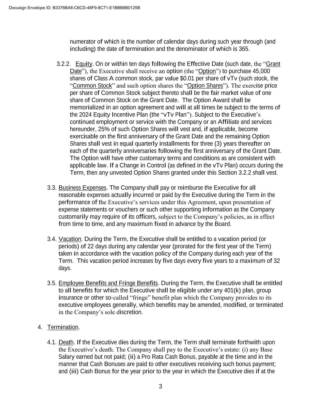 3 numerator of which is the number of calendar days during such year through (and including) the date of termination and the denominator of which is 365. 3.2.2. Equity. On or within ten days following the Effective Date (such date, the “Grant Date”), the Executive shall receive an option (the “Option”) to purchase 45,000 shares of Class A common stock, par value $0.01 per share of vTv (such stock, the “Common Stock” and such option shares the “Option Shares”). The exercise price per share of Common Stock subject thereto shall be the fair market value of one share of Common Stock on the Grant Date. The Option Award shall be memorialized in an option agreement and will at all times be subject to the terms of the 2024 Equity Incentive Plan (the “vTv Plan”). Subject to the Executive’s continued employment or service with the Company or an Affiliate and services hereunder, 25% of such Option Shares will vest and, if applicable, become exercisable on the first anniversary of the Grant Date and the remaining Option Shares shall vest in equal quarterly installments for three (3) years thereafter on each of the quarterly anniversaries following the first anniversary of the Grant Date. The Option will have other customary terms and conditions as are consistent with applicable law. If a Change in Control (as defined in the vTv Plan) occurs during the Term, then any unvested Option Shares granted under this Section 3.2.2 shall vest. 3.3. Business Expenses. The Company shall pay or reimburse the Executive for all reasonable expenses actually incurred or paid by the Executive during the Term in the performance of the Executive’s services under this Agreement, upon presentation of expense statements or vouchers or such other supporting information as the Company customarily may require of its officers, subject to the Company’s policies, as in effect from time to time, and any maximum fixed in advance by the Board. 3.4. Vacation. During the Term, the Executive shall be entitled to a vacation period (or periods) of 22 days during any calendar year (prorated for the first year of the Term) taken in accordance with the vacation policy of the Company during each year of the Term. This vacation period increases by five days every five years to a maximum of 32 days. 3.5. Employee Benefits and Fringe Benefits. During the Term, the Executive shall be entitled to all benefits for which the Executive shall be eligible under any 401(k) plan, group insurance or other so-called “fringe” benefit plan which the Company provides to its executive employees generally, which benefits may be amended, modified, or terminated in the Company’s sole discretion. 4. Termination. 4.1. Death. If the Executive dies during the Term, the Term shall terminate forthwith upon the Executive’s death. The Company shall pay to the Executive’s estate: (i) any Base Salary earned but not paid; (ii) a Pro Rata Cash Bonus, payable at the time and in the manner that Cash Bonuses are paid to other executives receiving such bonus payment; and (iii) Cash Bonus for the year prior to the year in which the Executive dies if at the Docusign Envelope ID: B3376BA8-C6CD-48F9-8C71-E1BBB8B0125B