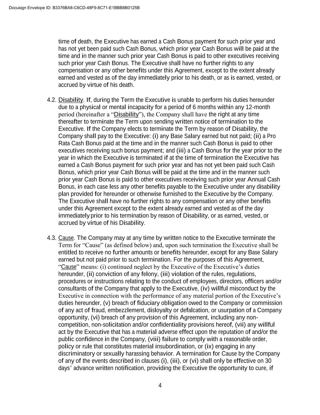 4 time of death, the Executive has earned a Cash Bonus payment for such prior year and has not yet been paid such Cash Bonus, which prior year Cash Bonus will be paid at the time and in the manner such prior year Cash Bonus is paid to other executives receiving such prior year Cash Bonus. The Executive shall have no further rights to any compensation or any other benefits under this Agreement, except to the extent already earned and vested as of the day immediately prior to his death, or as is earned, vested, or accrued by virtue of his death. 4.2. Disability. If, during the Term the Executive is unable to perform his duties hereunder due to a physical or mental incapacity for a period of 6 months within any 12-month period (hereinafter a “Disability”), the Company shall have the right at any time thereafter to terminate the Term upon sending written notice of termination to the Executive. If the Company elects to terminate the Term by reason of Disability, the Company shall pay to the Executive: (i) any Base Salary earned but not paid; (ii) a Pro Rata Cash Bonus paid at the time and in the manner such Cash Bonus is paid to other executives receiving such bonus payment; and (iii) a Cash Bonus for the year prior to the year in which the Executive is terminated if at the time of termination the Executive has earned a Cash Bonus payment for such prior year and has not yet been paid such Cash Bonus, which prior year Cash Bonus will be paid at the time and in the manner such prior year Cash Bonus is paid to other executives receiving such prior year Annual Cash Bonus, in each case less any other benefits payable to the Executive under any disability plan provided for hereunder or otherwise furnished to the Executive by the Company. The Executive shall have no further rights to any compensation or any other benefits under this Agreement except to the extent already earned and vested as of the day immediately prior to his termination by reason of Disability, or as earned, vested, or accrued by virtue of his Disability. 4.3. Cause. The Company may at any time by written notice to the Executive terminate the Term for “Cause” (as defined below) and, upon such termination the Executive shall be entitled to receive no further amounts or benefits hereunder, except for any Base Salary earned but not paid prior to such termination. For the purposes of this Agreement, “Cause” means: (i) continued neglect by the Executive of the Executive’s duties hereunder, (ii) conviction of any felony, (iii) violation of the rules, regulations, procedures or instructions relating to the conduct of employees, directors, officers and/or consultants of the Company that apply to the Executive, (iv) willful misconduct by the Executive in connection with the performance of any material portion of the Executive’s duties hereunder, (v) breach of fiduciary obligation owed to the Company or commission of any act of fraud, embezzlement, disloyalty or defalcation, or usurpation of a Company opportunity, (vi) breach of any provision of this Agreement, including any non- competition, non-solicitation and/or confidentiality provisions hereof, (vii) any willful act by the Executive that has a material adverse effect upon the reputation of and/or the public confidence in the Company, (viii) failure to comply with a reasonable order, policy or rule that constitutes material insubordination, or (ix) engaging in any discriminatory or sexually harassing behavior. A termination for Cause by the Company of any of the events described in clauses (i), (iii), or (vi) shall only be effective on 30 days’ advance written notification, providing the Executive the opportunity to cure, if Docusign Envelope ID: B3376BA8-C6CD-48F9-8C71-E1BBB8B0125B