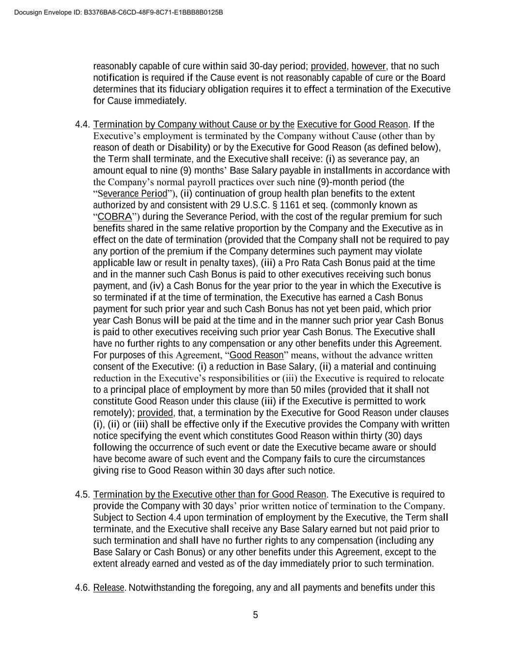 5 reasonably capable of cure within said 30-day period; provided, however, that no such notification is required if the Cause event is not reasonably capable of cure or the Board determines that its fiduciary obligation requires it to effect a termination of the Executive for Cause immediately. 4.4. Termination by Company without Cause or by the Executive for Good Reason. If the Executive’s employment is terminated by the Company without Cause (other than by reason of death or Disability) or by the Executive for Good Reason (as defined below), the Term shall terminate, and the Executive shall receive: (i) as severance pay, an amount equal to nine (9) months’ Base Salary payable in installments in accordance with the Company’s normal payroll practices over such nine (9)-month period (the “Severance Period”), (ii) continuation of group health plan benefits to the extent authorized by and consistent with 29 U.S.C. § 1161 et seq. (commonly known as “COBRA”) during the Severance Period, with the cost of the regular premium for such benefits shared in the same relative proportion by the Company and the Executive as in effect on the date of termination (provided that the Company shall not be required to pay any portion of the premium if the Company determines such payment may violate applicable law or result in penalty taxes), (iii) a Pro Rata Cash Bonus paid at the time and in the manner such Cash Bonus is paid to other executives receiving such bonus payment, and (iv) a Cash Bonus for the year prior to the year in which the Executive is so terminated if at the time of termination, the Executive has earned a Cash Bonus payment for such prior year and such Cash Bonus has not yet been paid, which prior year Cash Bonus will be paid at the time and in the manner such prior year Cash Bonus is paid to other executives receiving such prior year Cash Bonus. The Executive shall have no further rights to any compensation or any other benefits under this Agreement. For purposes of this Agreement, “Good Reason” means, without the advance written consent of the Executive: (i) a reduction in Base Salary, (ii) a material and continuing reduction in the Executive’s responsibilities or (iii) the Executive is required to relocate to a principal place of employment by more than 50 miles (provided that it shall not constitute Good Reason under this clause (iii) if the Executive is permitted to work remotely); provided, that, a termination by the Executive for Good Reason under clauses (i), (ii) or (iii) shall be effective only if the Executive provides the Company with written notice specifying the event which constitutes Good Reason within thirty (30) days following the occurrence of such event or date the Executive became aware or should have become aware of such event and the Company fails to cure the circumstances giving rise to Good Reason within 30 days after such notice. 4.5. Termination by the Executive other than for Good Reason. The Executive is required to provide the Company with 30 days’ prior written notice of termination to the Company. Subject to Section 4.4 upon termination of employment by the Executive, the Term shall terminate, and the Executive shall receive any Base Salary earned but not paid prior to such termination and shall have no further rights to any compensation (including any Base Salary or Cash Bonus) or any other benefits under this Agreement, except to the extent already earned and vested as of the day immediately prior to such termination. 4.6. Release. Notwithstanding the foregoing, any and all payments and benefits under this Docusign Envelope ID: B3376BA8-C6CD-48F9-8C71-E1BBB8B0125B