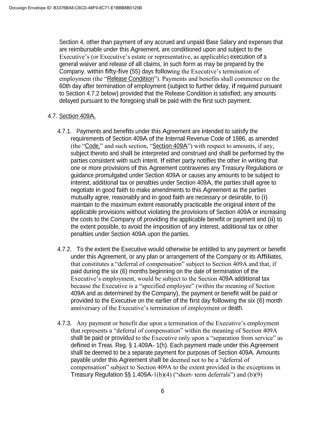 6 Section 4, other than payment of any accrued and unpaid Base Salary and expenses that are reimbursable under this Agreement, are conditioned upon and subject to the Executive’s (or Executive’s estate or representative, as applicable) execution of a general waiver and release of all claims, in such form as may be prepared by the Company. within fifty-five (55) days following the Executive’s termination of employment (the “Release Condition”). Payments and benefits shall commence on the 60th day after termination of employment (subject to further delay, if required pursuant to Section 4.7.2 below) provided that the Release Condition is satisfied; any amounts delayed pursuant to the foregoing shall be paid with the first such payment. 4.7. Section 409A. 4.7.1. Payments and benefits under this Agreement are intended to satisfy the requirements of Section 409A of the Internal Revenue Code of 1986, as amended (the “Code,” and such section, “Section 409A”) with respect to amounts, if any, subject thereto and shall be interpreted and construed and shall be performed by the parties consistent with such intent. If either party notifies the other in writing that one or more provisions of this Agreement contravenes any Treasury Regulations or guidance promulgated under Section 409A or causes any amounts to be subject to interest, additional tax or penalties under Section 409A, the parties shall agree to negotiate in good faith to make amendments to this Agreement as the parties mutually agree, reasonably and in good faith are necessary or desirable, to (i) maintain to the maximum extent reasonably practicable the original intent of the applicable provisions without violating the provisions of Section 409A or increasing the costs to the Company of providing the applicable benefit or payment and (ii) to the extent possible, to avoid the imposition of any interest, additional tax or other penalties under Section 409A upon the parties. 4.7.2. To the extent the Executive would otherwise be entitled to any payment or benefit under this Agreement, or any plan or arrangement of the Company or its Affiliates, that constitutes a “deferral of compensation” subject to Section 409A and that, if paid during the six (6) months beginning on the date of termination of the Executive’s employment, would be subject to the Section 409A additional tax because the Executive is a “specified employee” (within the meaning of Section 409A and as determined by the Company), the payment or benefit will be paid or provided to the Executive on the earlier of the first day following the six (6) month anniversary of the Executive’s termination of employment or death. 4.7.3. Any payment or benefit due upon a termination of the Executive’s employment that represents a “deferral of compensation” within the meaning of Section 409A shall be paid or provided to the Executive only upon a “separation from service” as defined in Treas. Reg. § 1.409A- 1(h). Each payment made under this Agreement shall be deemed to be a separate payment for purposes of Section 409A. Amounts payable under this Agreement shall be deemed not to be a “deferral of compensation” subject to Section 409A to the extent provided in the exceptions in Treasury Regulation §§ 1.409A-1(b)(4) (“short- term deferrals”) and (b)(9) Docusign Envelope ID: B3376BA8-C6CD-48F9-8C71-E1BBB8B0125B