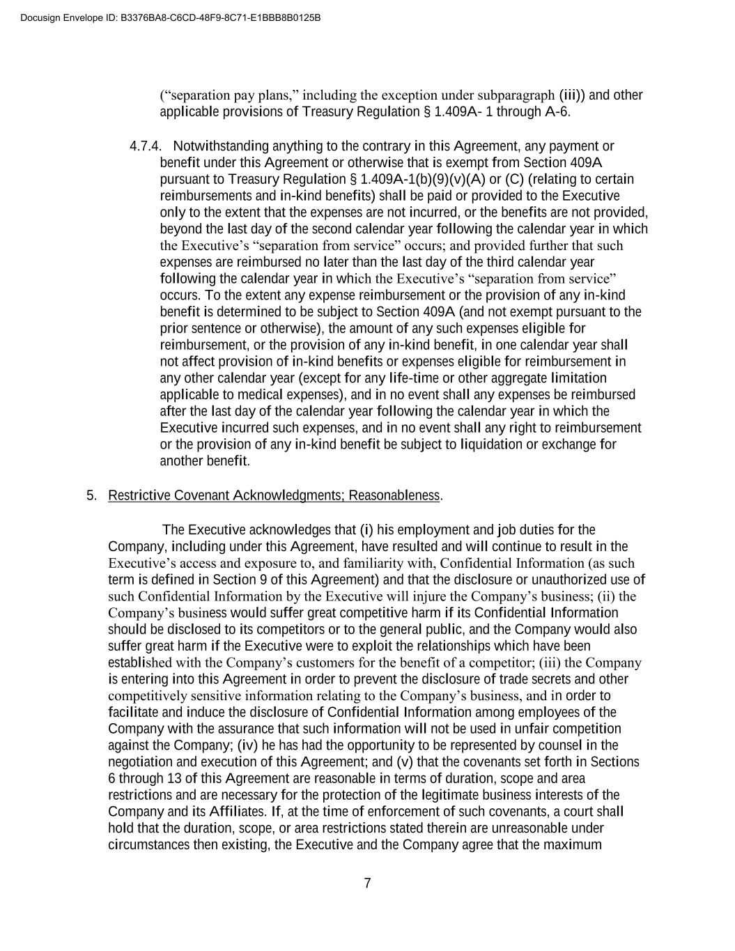 7 (“separation pay plans,” including the exception under subparagraph (iii)) and other applicable provisions of Treasury Regulation § 1.409A- 1 through A-6. 4.7.4. Notwithstanding anything to the contrary in this Agreement, any payment or benefit under this Agreement or otherwise that is exempt from Section 409A pursuant to Treasury Regulation § 1.409A-1(b)(9)(v)(A) or (C) (relating to certain reimbursements and in-kind benefits) shall be paid or provided to the Executive only to the extent that the expenses are not incurred, or the benefits are not provided, beyond the last day of the second calendar year following the calendar year in which the Executive’s “separation from service” occurs; and provided further that such expenses are reimbursed no later than the last day of the third calendar year following the calendar year in which the Executive’s “separation from service” occurs. To the extent any expense reimbursement or the provision of any in-kind benefit is determined to be subject to Section 409A (and not exempt pursuant to the prior sentence or otherwise), the amount of any such expenses eligible for reimbursement, or the provision of any in-kind benefit, in one calendar year shall not affect provision of in-kind benefits or expenses eligible for reimbursement in any other calendar year (except for any life-time or other aggregate limitation applicable to medical expenses), and in no event shall any expenses be reimbursed after the last day of the calendar year following the calendar year in which the Executive incurred such expenses, and in no event shall any right to reimbursement or the provision of any in-kind benefit be subject to liquidation or exchange for another benefit. 5. Restrictive Covenant Acknowledgments; Reasonableness. The Executive acknowledges that (i) his employment and job duties for the Company, including under this Agreement, have resulted and will continue to result in the Executive’s access and exposure to, and familiarity with, Confidential Information (as such term is defined in Section 9 of this Agreement) and that the disclosure or unauthorized use of such Confidential Information by the Executive will injure the Company’s business; (ii) the Company’s business would suffer great competitive harm if its Confidential Information should be disclosed to its competitors or to the general public, and the Company would also suffer great harm if the Executive were to exploit the relationships which have been established with the Company’s customers for the benefit of a competitor; (iii) the Company is entering into this Agreement in order to prevent the disclosure of trade secrets and other competitively sensitive information relating to the Company’s business, and in order to facilitate and induce the disclosure of Confidential Information among employees of the Company with the assurance that such information will not be used in unfair competition against the Company; (iv) he has had the opportunity to be represented by counsel in the negotiation and execution of this Agreement; and (v) that the covenants set forth in Sections 6 through 13 of this Agreement are reasonable in terms of duration, scope and area restrictions and are necessary for the protection of the legitimate business interests of the Company and its Affiliates. If, at the time of enforcement of such covenants, a court shall hold that the duration, scope, or area restrictions stated therein are unreasonable under circumstances then existing, the Executive and the Company agree that the maximum Docusign Envelope ID: B3376BA8-C6CD-48F9-8C71-E1BBB8B0125B