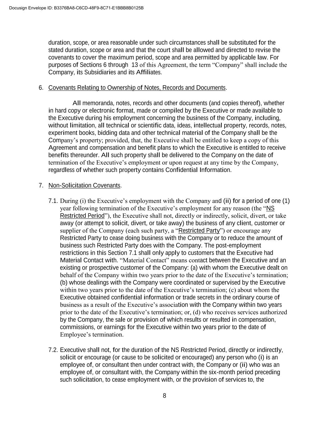 8 duration, scope, or area reasonable under such circumstances shall be substituted for the stated duration, scope or area and that the court shall be allowed and directed to revise the covenants to cover the maximum period, scope and area permitted by applicable law. For purposes of Sections 6 through 13 of this Agreement, the term “Company” shall include the Company, its Subsidiaries and its Affiliates. 6. Covenants Relating to Ownership of Notes, Records and Documents. All memoranda, notes, records and other documents (and copies thereof), whether in hard copy or electronic format, made or compiled by the Executive or made available to the Executive during his employment concerning the business of the Company, including, without limitation, all technical or scientific data, ideas, intellectual property, records, notes, experiment books, bidding data and other technical material of the Company shall be the Company’s property; provided, that, the Executive shall be entitled to keep a copy of this Agreement and compensation and benefit plans to which the Executive is entitled to receive benefits thereunder. All such property shall be delivered to the Company on the date of termination of the Executive’s employment or upon request at any time by the Company, regardless of whether such property contains Confidential Information. 7. Non-Solicitation Covenants. 7.1. During (i) the Executive’s employment with the Company and (ii) for a period of one (1) year following termination of the Executive’s employment for any reason (the “NS Restricted Period”), the Executive shall not, directly or indirectly, solicit, divert, or take away (or attempt to solicit, divert, or take away) the business of any client, customer or supplier of the Company (each such party, a “Restricted Party”) or encourage any Restricted Party to cease doing business with the Company or to reduce the amount of business such Restricted Party does with the Company. The post-employment restrictions in this Section 7.1 shall only apply to customers that the Executive had Material Contact with. “Material Contact” means contact between the Executive and an existing or prospective customer of the Company: (a) with whom the Executive dealt on behalf of the Company within two years prior to the date of the Executive’s termination; (b) whose dealings with the Company were coordinated or supervised by the Executive within two years prior to the date of the Executive’s termination; (c) about whom the Executive obtained confidential information or trade secrets in the ordinary course of business as a result of the Executive’s association with the Company within two years prior to the date of the Executive’s termination; or, (d) who receives services authorized by the Company, the sale or provision of which results or resulted in compensation, commissions, or earnings for the Executive within two years prior to the date of Employee’s termination. 7.2. Executive shall not, for the duration of the NS Restricted Period, directly or indirectly, solicit or encourage (or cause to be solicited or encouraged) any person who (i) is an employee of, or consultant then under contract with, the Company or (ii) who was an employee of, or consultant with, the Company within the six-month period preceding such solicitation, to cease employment with, or the provision of services to, the Docusign Envelope ID: B3376BA8-C6CD-48F9-8C71-E1BBB8B0125B
