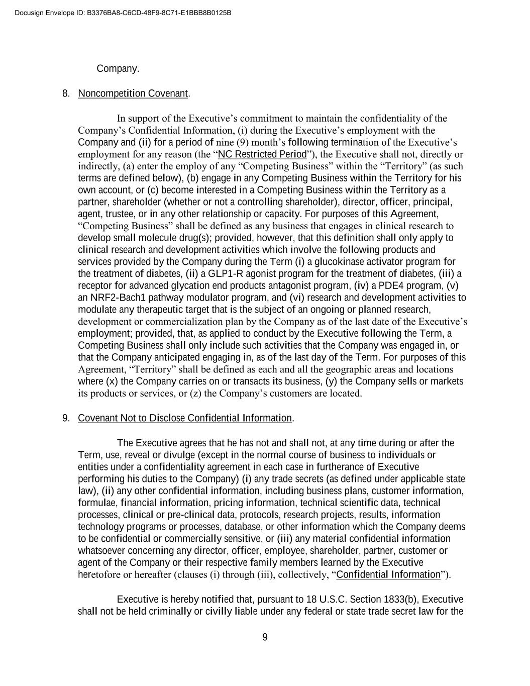 9 Company. 8. Noncompetition Covenant. In support of the Executive’s commitment to maintain the confidentiality of the Company’s Confidential Information, (i) during the Executive’s employment with the Company and (ii) for a period of nine (9) month’s following termination of the Executive’s employment for any reason (the “NC Restricted Period”), the Executive shall not, directly or indirectly, (a) enter the employ of any “Competing Business” within the “Territory” (as such terms are defined below), (b) engage in any Competing Business within the Territory for his own account, or (c) become interested in a Competing Business within the Territory as a partner, shareholder (whether or not a controlling shareholder), director, officer, principal, agent, trustee, or in any other relationship or capacity. For purposes of this Agreement, “Competing Business” shall be defined as any business that engages in clinical research to develop small molecule drug(s); provided, however, that this definition shall only apply to clinical research and development activities which involve the following products and services provided by the Company during the Term (i) a glucokinase activator program for the treatment of diabetes, (ii) a GLP1-R agonist program for the treatment of diabetes, (iii) a receptor for advanced glycation end products antagonist program, (iv) a PDE4 program, (v) an NRF2-Bach1 pathway modulator program, and (vi) research and development activities to modulate any therapeutic target that is the subject of an ongoing or planned research, development or commercialization plan by the Company as of the last date of the Executive’s employment; provided, that, as applied to conduct by the Executive following the Term, a Competing Business shall only include such activities that the Company was engaged in, or that the Company anticipated engaging in, as of the last day of the Term. For purposes of this Agreement, “Territory” shall be defined as each and all the geographic areas and locations where (x) the Company carries on or transacts its business, (y) the Company sells or markets its products or services, or (z) the Company’s customers are located. 9. Covenant Not to Disclose Confidential Information. The Executive agrees that he has not and shall not, at any time during or after the Term, use, reveal or divulge (except in the normal course of business to individuals or entities under a confidentiality agreement in each case in furtherance of Executive performing his duties to the Company) (i) any trade secrets (as defined under applicable state law), (ii) any other confidential information, including business plans, customer information, formulae, financial information, pricing information, technical scientific data, technical processes, clinical or pre-clinical data, protocols, research projects, results, information technology programs or processes, database, or other information which the Company deems to be confidential or commercially sensitive, or (iii) any material confidential information whatsoever concerning any director, officer, employee, shareholder, partner, customer or agent of the Company or their respective family members learned by the Executive heretofore or hereafter (clauses (i) through (iii), collectively, “Confidential Information”). Executive is hereby notified that, pursuant to 18 U.S.C. Section 1833(b), Executive shall not be held criminally or civilly liable under any federal or state trade secret law for the Docusign Envelope ID: B3376BA8-C6CD-48F9-8C71-E1BBB8B0125B