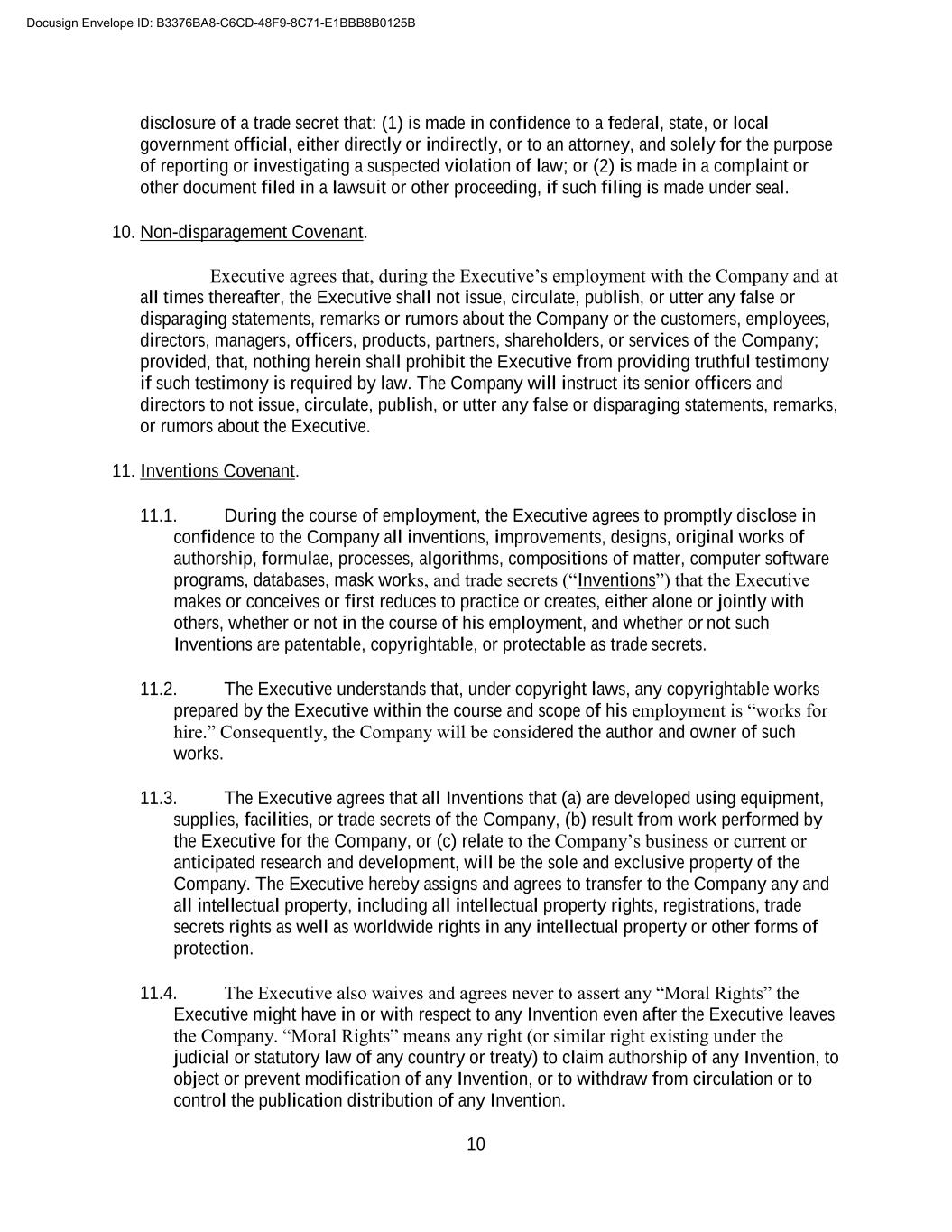10 disclosure of a trade secret that: (1) is made in confidence to a federal, state, or local government official, either directly or indirectly, or to an attorney, and solely for the purpose of reporting or investigating a suspected violation of law; or (2) is made in a complaint or other document filed in a lawsuit or other proceeding, if such filing is made under seal. 10. Non-disparagement Covenant. Executive agrees that, during the Executive’s employment with the Company and at all times thereafter, the Executive shall not issue, circulate, publish, or utter any false or disparaging statements, remarks or rumors about the Company or the customers, employees, directors, managers, officers, products, partners, shareholders, or services of the Company; provided, that, nothing herein shall prohibit the Executive from providing truthful testimony if such testimony is required by law. The Company will instruct its senior officers and directors to not issue, circulate, publish, or utter any false or disparaging statements, remarks, or rumors about the Executive. 11. Inventions Covenant. 11.1. During the course of employment, the Executive agrees to promptly disclose in confidence to the Company all inventions, improvements, designs, original works of authorship, formulae, processes, algorithms, compositions of matter, computer software programs, databases, mask works, and trade secrets (“Inventions”) that the Executive makes or conceives or first reduces to practice or creates, either alone or jointly with others, whether or not in the course of his employment, and whether or not such Inventions are patentable, copyrightable, or protectable as trade secrets. 11.2. The Executive understands that, under copyright laws, any copyrightable works prepared by the Executive within the course and scope of his employment is “works for hire.” Consequently, the Company will be considered the author and owner of such works. 11.3. The Executive agrees that all Inventions that (a) are developed using equipment, supplies, facilities, or trade secrets of the Company, (b) result from work performed by the Executive for the Company, or (c) relate to the Company’s business or current or anticipated research and development, will be the sole and exclusive property of the Company. The Executive hereby assigns and agrees to transfer to the Company any and all intellectual property, including all intellectual property rights, registrations, trade secrets rights as well as worldwide rights in any intellectual property or other forms of protection. 11.4. The Executive also waives and agrees never to assert any “Moral Rights” the Executive might have in or with respect to any Invention even after the Executive leaves the Company. “Moral Rights” means any right (or similar right existing under the judicial or statutory law of any country or treaty) to claim authorship of any Invention, to object or prevent modification of any Invention, or to withdraw from circulation or to control the publication distribution of any Invention. Docusign Envelope ID: B3376BA8-C6CD-48F9-8C71-E1BBB8B0125B