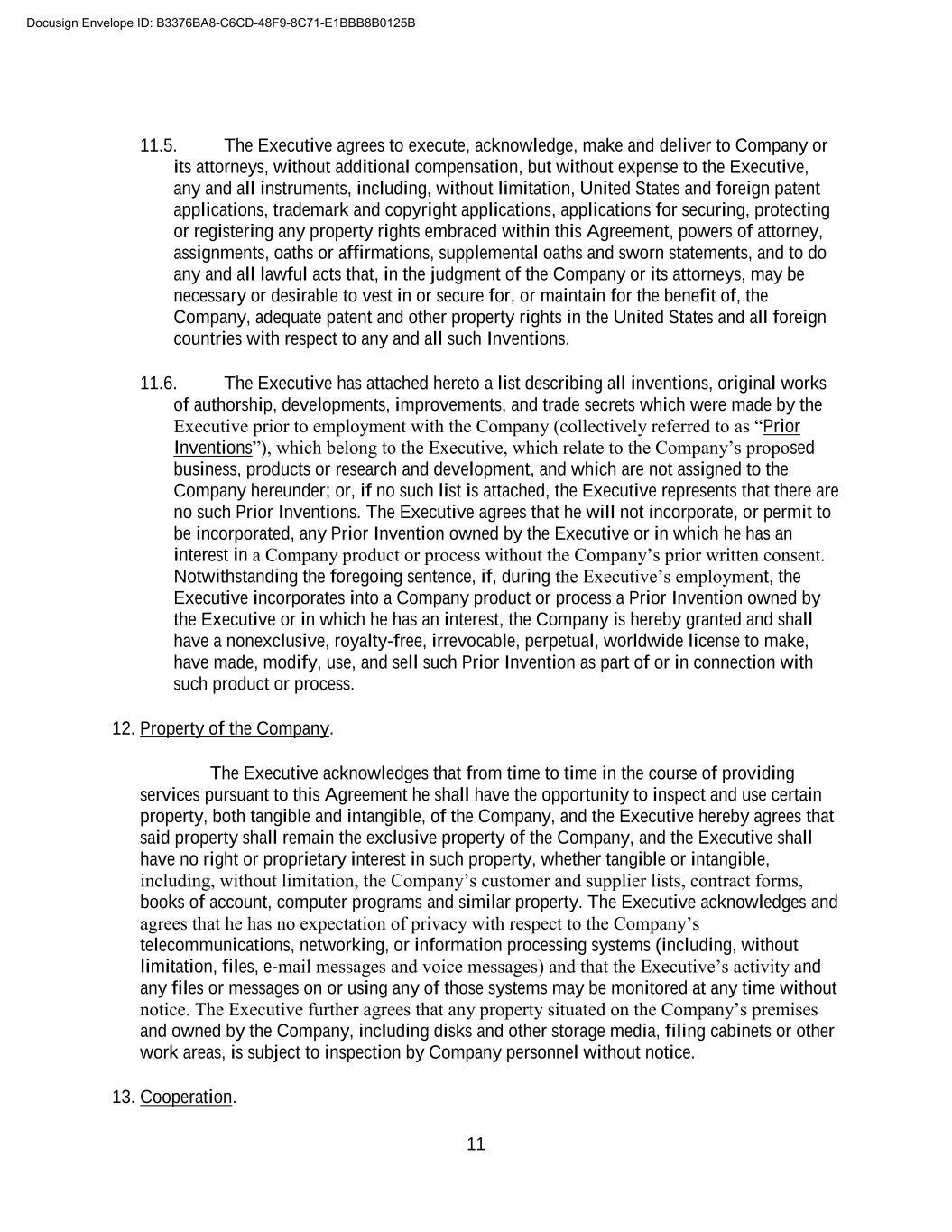 11 11.5. The Executive agrees to execute, acknowledge, make and deliver to Company or its attorneys, without additional compensation, but without expense to the Executive, any and all instruments, including, without limitation, United States and foreign patent applications, trademark and copyright applications, applications for securing, protecting or registering any property rights embraced within this Agreement, powers of attorney, assignments, oaths or affirmations, supplemental oaths and sworn statements, and to do any and all lawful acts that, in the judgment of the Company or its attorneys, may be necessary or desirable to vest in or secure for, or maintain for the benefit of, the Company, adequate patent and other property rights in the United States and all foreign countries with respect to any and all such Inventions. 11.6. The Executive has attached hereto a list describing all inventions, original works of authorship, developments, improvements, and trade secrets which were made by the Executive prior to employment with the Company (collectively referred to as “Prior Inventions”), which belong to the Executive, which relate to the Company’s proposed business, products or research and development, and which are not assigned to the Company hereunder; or, if no such list is attached, the Executive represents that there are no such Prior Inventions. The Executive agrees that he will not incorporate, or permit to be incorporated, any Prior Invention owned by the Executive or in which he has an interest in a Company product or process without the Company’s prior written consent. Notwithstanding the foregoing sentence, if, during the Executive’s employment, the Executive incorporates into a Company product or process a Prior Invention owned by the Executive or in which he has an interest, the Company is hereby granted and shall have a nonexclusive, royalty-free, irrevocable, perpetual, worldwide license to make, have made, modify, use, and sell such Prior Invention as part of or in connection with such product or process. 12. Property of the Company. The Executive acknowledges that from time to time in the course of providing services pursuant to this Agreement he shall have the opportunity to inspect and use certain property, both tangible and intangible, of the Company, and the Executive hereby agrees that said property shall remain the exclusive property of the Company, and the Executive shall have no right or proprietary interest in such property, whether tangible or intangible, including, without limitation, the Company’s customer and supplier lists, contract forms, books of account, computer programs and similar property. The Executive acknowledges and agrees that he has no expectation of privacy with respect to the Company’s telecommunications, networking, or information processing systems (including, without limitation, files, e-mail messages and voice messages) and that the Executive’s activity and any files or messages on or using any of those systems may be monitored at any time without notice. The Executive further agrees that any property situated on the Company’s premises and owned by the Company, including disks and other storage media, filing cabinets or other work areas, is subject to inspection by Company personnel without notice. 13. Cooperation. Docusign Envelope ID: B3376BA8-C6CD-48F9-8C71-E1BBB8B0125B