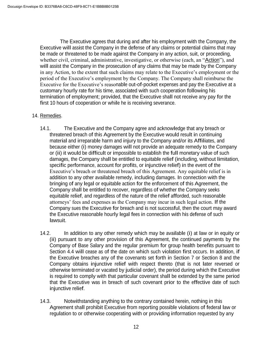 12 The Executive agrees that during and after his employment with the Company, the Executive will assist the Company in the defense of any claims or potential claims that may be made or threatened to be made against the Company in any action, suit, or proceeding, whether civil, criminal, administrative, investigative, or otherwise (each, an “Action”), and will assist the Company in the prosecution of any claims that may be made by the Company in any Action, to the extent that such claims may relate to the Executive’s employment or the period of the Executive’s employment by the Company. The Company shall reimburse the Executive for the Executive’s reasonable out-of-pocket expenses and pay the Executive at a customary hourly rate for his time, associated with such cooperation following his termination of employment; provided, that the Executive shall not receive any pay for the first 10 hours of cooperation or while he is receiving severance. 14. Remedies. 14.1. The Executive and the Company agree and acknowledge that any breach or threatened breach of this Agreement by the Executive would result in continuing material and irreparable harm and injury to the Company and/or its Affiliates, and because either (i) money damages will not provide an adequate remedy to the Company or (ii) it would be difficult or impossible to establish the full monetary value of such damages, the Company shall be entitled to equitable relief (including, without limitation, specific performance, account for profits, or injunctive relief) in the event of the Executive’s breach or threatened breach of this Agreement. Any equitable relief is in addition to any other available remedy, including damages. In connection with the bringing of any legal or equitable action for the enforcement of this Agreement, the Company shall be entitled to recover, regardless of whether the Company seeks equitable relief, and regardless of the nature of the relief afforded, such reasonable attorneys’ fees and expenses as the Company may incur in such legal action. If the Company sues the Executive for breach and is not successful, then the court may award the Executive reasonable hourly legal fees in connection with his defense of such lawsuit. 14.2. In addition to any other remedy which may be available (i) at law or in equity or (ii) pursuant to any other provision of this Agreement, the continued payments by the Company of Base Salary and the regular premium for group health benefits pursuant to Section 4.4 will cease as of the date on which such violation first occurs. In addition, if the Executive breaches any of the covenants set forth in Section 7 or Section 8 and the Company obtains injunctive relief with respect thereto (that is not later reversed or otherwise terminated or vacated by judicial order), the period during which the Executive is required to comply with that particular covenant shall be extended by the same period that the Executive was in breach of such covenant prior to the effective date of such injunctive relief. 14.3. Notwithstanding anything to the contrary contained herein, nothing in this Agreement shall prohibit Executive from reporting possible violations of federal law or regulation to or otherwise cooperating with or providing information requested by any Docusign Envelope ID: B3376BA8-C6CD-48F9-8C71-E1BBB8B0125B