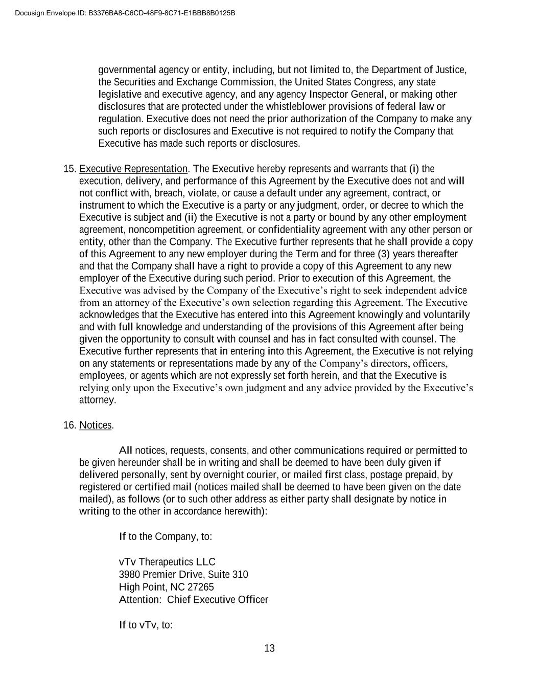 13 governmental agency or entity, including, but not limited to, the Department of Justice, the Securities and Exchange Commission, the United States Congress, any state legislative and executive agency, and any agency Inspector General, or making other disclosures that are protected under the whistleblower provisions of federal law or regulation. Executive does not need the prior authorization of the Company to make any such reports or disclosures and Executive is not required to notify the Company that Executive has made such reports or disclosures. 15. Executive Representation. The Executive hereby represents and warrants that (i) the execution, delivery, and performance of this Agreement by the Executive does not and will not conflict with, breach, violate, or cause a default under any agreement, contract, or instrument to which the Executive is a party or any judgment, order, or decree to which the Executive is subject and (ii) the Executive is not a party or bound by any other employment agreement, noncompetition agreement, or confidentiality agreement with any other person or entity, other than the Company. The Executive further represents that he shall provide a copy of this Agreement to any new employer during the Term and for three (3) years thereafter and that the Company shall have a right to provide a copy of this Agreement to any new employer of the Executive during such period. Prior to execution of this Agreement, the Executive was advised by the Company of the Executive’s right to seek independent advice from an attorney of the Executive’s own selection regarding this Agreement. The Executive acknowledges that the Executive has entered into this Agreement knowingly and voluntarily and with full knowledge and understanding of the provisions of this Agreement after being given the opportunity to consult with counsel and has in fact consulted with counsel. The Executive further represents that in entering into this Agreement, the Executive is not relying on any statements or representations made by any of the Company’s directors, officers, employees, or agents which are not expressly set forth herein, and that the Executive is relying only upon the Executive’s own judgment and any advice provided by the Executive’s attorney. 16. Notices. All notices, requests, consents, and other communications required or permitted to be given hereunder shall be in writing and shall be deemed to have been duly given if delivered personally, sent by overnight courier, or mailed first class, postage prepaid, by registered or certified mail (notices mailed shall be deemed to have been given on the date mailed), as follows (or to such other address as either party shall designate by notice in writing to the other in accordance herewith): If to the Company, to: vTv Therapeutics LLC 3980 Premier Drive, Suite 310 High Point, NC 27265 Attention: Chief Executive Officer If to vTv, to: Docusign Envelope ID: B3376BA8-C6CD-48F9-8C71-E1BBB8B0125B