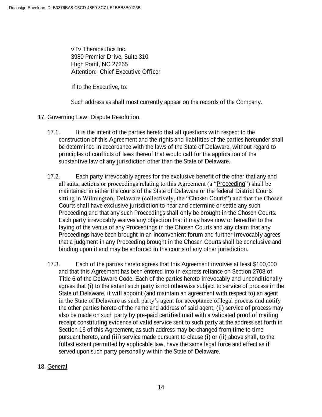 14 vTv Therapeutics Inc. 3980 Premier Drive, Suite 310 High Point, NC 27265 Attention: Chief Executive Officer If to the Executive, to: Such address as shall most currently appear on the records of the Company. 17. Governing Law; Dispute Resolution. 17.1. It is the intent of the parties hereto that all questions with respect to the construction of this Agreement and the rights and liabilities of the parties hereunder shall be determined in accordance with the laws of the State of Delaware, without regard to principles of conflicts of laws thereof that would call for the application of the substantive law of any jurisdiction other than the State of Delaware. 17.2. Each party irrevocably agrees for the exclusive benefit of the other that any and all suits, actions or proceedings relating to this Agreement (a “Proceeding”) shall be maintained in either the courts of the State of Delaware or the federal District Courts sitting in Wilmington, Delaware (collectively, the “Chosen Courts”) and that the Chosen Courts shall have exclusive jurisdiction to hear and determine or settle any such Proceeding and that any such Proceedings shall only be brought in the Chosen Courts. Each party irrevocably waives any objection that it may have now or hereafter to the laying of the venue of any Proceedings in the Chosen Courts and any claim that any Proceedings have been brought in an inconvenient forum and further irrevocably agrees that a judgment in any Proceeding brought in the Chosen Courts shall be conclusive and binding upon it and may be enforced in the courts of any other jurisdiction. 17.3. Each of the parties hereto agrees that this Agreement involves at least $100,000 and that this Agreement has been entered into in express reliance on Section 2708 of Title 6 of the Delaware Code. Each of the parties hereto irrevocably and unconditionally agrees that (i) to the extent such party is not otherwise subject to service of process in the State of Delaware, it will appoint (and maintain an agreement with respect to) an agent in the State of Delaware as such party’s agent for acceptance of legal process and notify the other parties hereto of the name and address of said agent, (ii) service of process may also be made on such party by pre-paid certified mail with a validated proof of mailing receipt constituting evidence of valid service sent to such party at the address set forth in Section 16 of this Agreement, as such address may be changed from time to time pursuant hereto, and (iii) service made pursuant to clause (i) or (ii) above shall, to the fullest extent permitted by applicable law, have the same legal force and effect as if served upon such party personally within the State of Delaware. 18. General. Docusign Envelope ID: B3376BA8-C6CD-48F9-8C71-E1BBB8B0125B