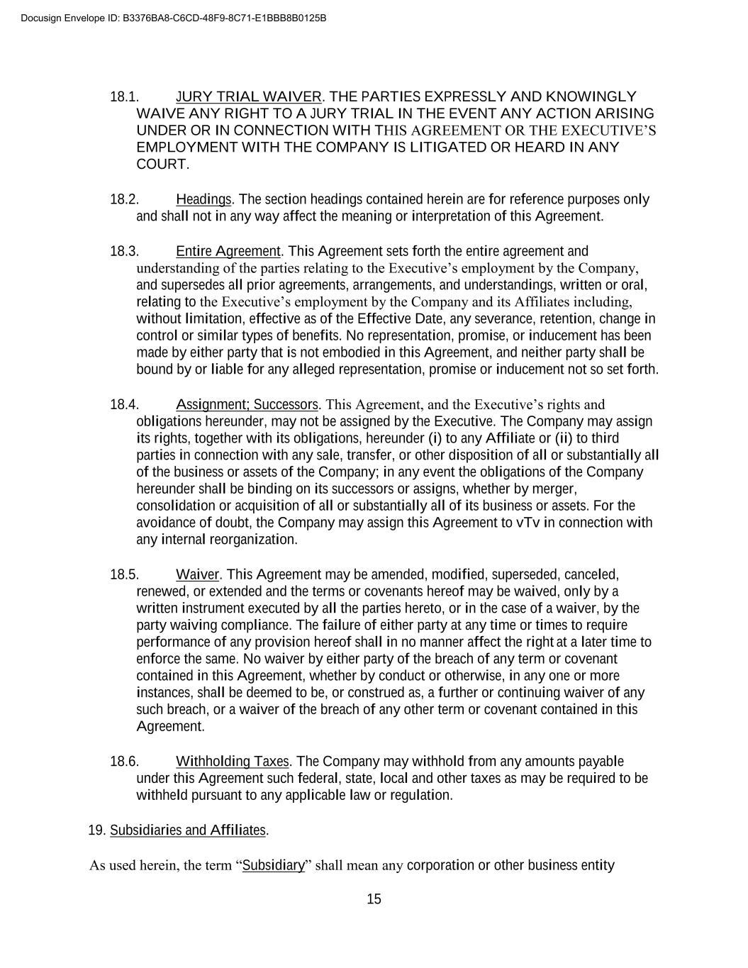 15 18.1. JURY TRIAL WAIVER. THE PARTIES EXPRESSLY AND KNOWINGLY WAIVE ANY RIGHT TO A JURY TRIAL IN THE EVENT ANY ACTION ARISING UNDER OR IN CONNECTION WITH THIS AGREEMENT OR THE EXECUTIVE’S EMPLOYMENT WITH THE COMPANY IS LITIGATED OR HEARD IN ANY COURT. 18.2. Headings. The section headings contained herein are for reference purposes only and shall not in any way affect the meaning or interpretation of this Agreement. 18.3. Entire Agreement. This Agreement sets forth the entire agreement and understanding of the parties relating to the Executive’s employment by the Company, and supersedes all prior agreements, arrangements, and understandings, written or oral, relating to the Executive’s employment by the Company and its Affiliates including, without limitation, effective as of the Effective Date, any severance, retention, change in control or similar types of benefits. No representation, promise, or inducement has been made by either party that is not embodied in this Agreement, and neither party shall be bound by or liable for any alleged representation, promise or inducement not so set forth. 18.4. Assignment; Successors. This Agreement, and the Executive’s rights and obligations hereunder, may not be assigned by the Executive. The Company may assign its rights, together with its obligations, hereunder (i) to any Affiliate or (ii) to third parties in connection with any sale, transfer, or other disposition of all or substantially all of the business or assets of the Company; in any event the obligations of the Company hereunder shall be binding on its successors or assigns, whether by merger, consolidation or acquisition of all or substantially all of its business or assets. For the avoidance of doubt, the Company may assign this Agreement to vTv in connection with any internal reorganization. 18.5. Waiver. This Agreement may be amended, modified, superseded, canceled, renewed, or extended and the terms or covenants hereof may be waived, only by a written instrument executed by all the parties hereto, or in the case of a waiver, by the party waiving compliance. The failure of either party at any time or times to require performance of any provision hereof shall in no manner affect the right at a later time to enforce the same. No waiver by either party of the breach of any term or covenant contained in this Agreement, whether by conduct or otherwise, in any one or more instances, shall be deemed to be, or construed as, a further or continuing waiver of any such breach, or a waiver of the breach of any other term or covenant contained in this Agreement. 18.6. Withholding Taxes. The Company may withhold from any amounts payable under this Agreement such federal, state, local and other taxes as may be required to be withheld pursuant to any applicable law or regulation. 19. Subsidiaries and Affiliates. As used herein, the term “Subsidiary” shall mean any corporation or other business entity Docusign Envelope ID: B3376BA8-C6CD-48F9-8C71-E1BBB8B0125B