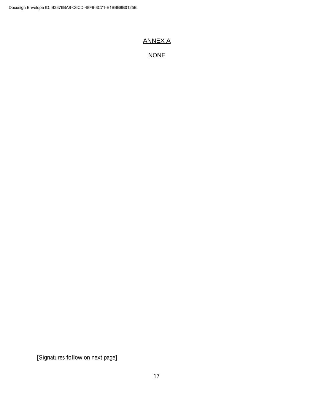 17 ANNEX A NONE [Signatures follow on next page] Docusign Envelope ID: B3376BA8-C6CD-48F9-8C71-E1BBB8B0125B