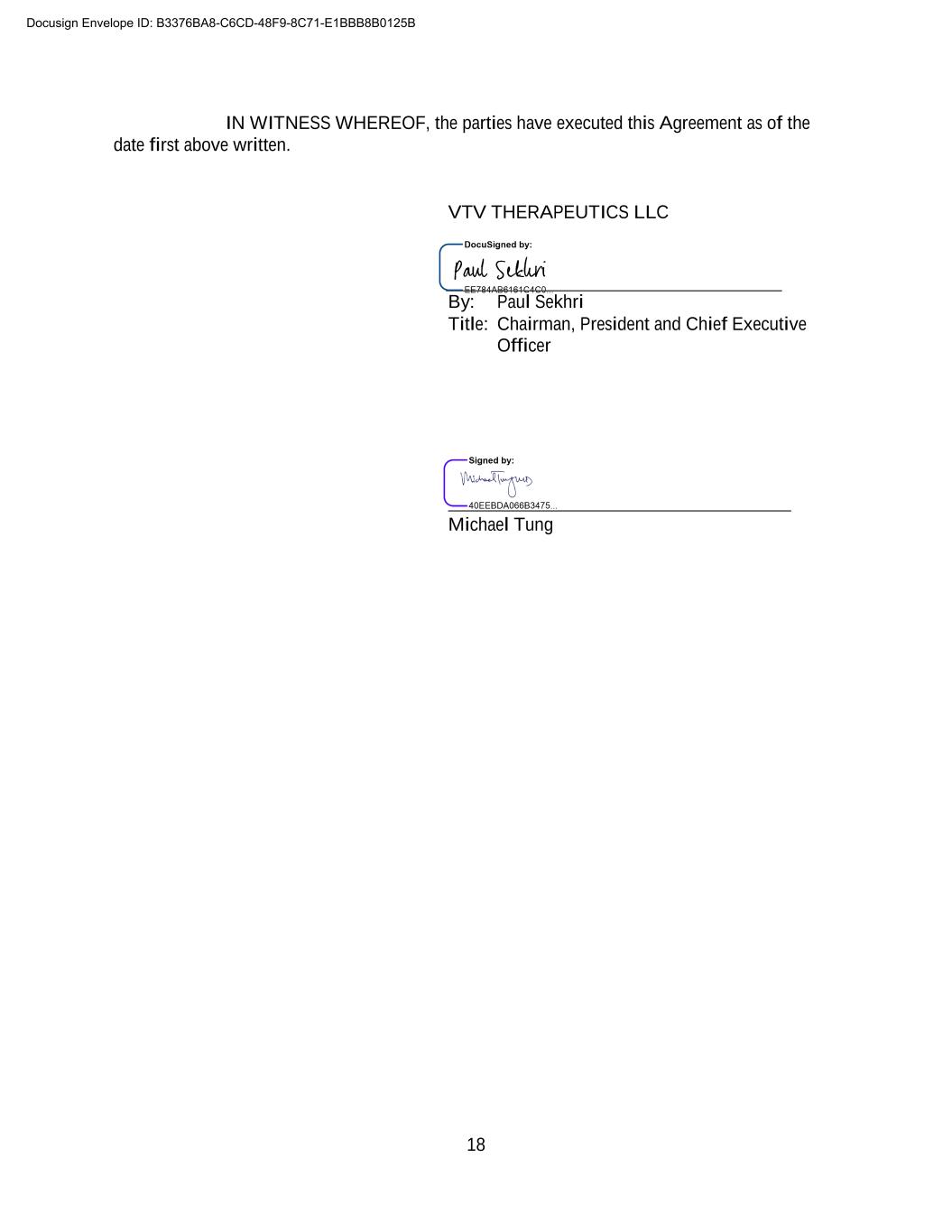 18 IN WITNESS WHEREOF, the parties have executed this Agreement as of the date first above written. VTV THERAPEUTICS LLC By: Paul Sekhri Title: Chairman, President and Chief Executive Officer Michael Tung Docusign Envelope ID: B3376BA8-C6CD-48F9-8C71-E1BBB8B0125B