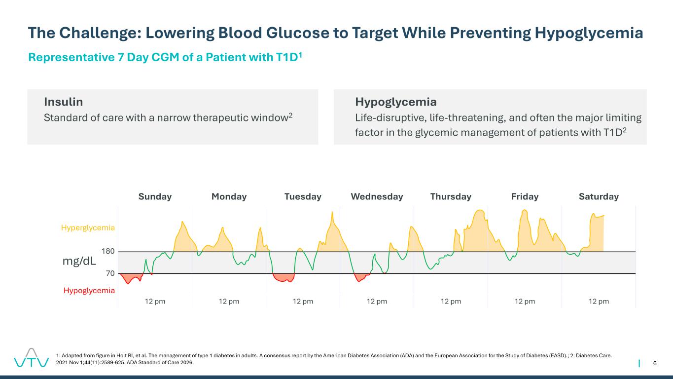 6 Representative 7 Day CGM of a Patient with T1D1 The Challenge: Lowering Blood Glucose to Target While Preventing Hypoglycemia 1: Adapted from figure in Holt RI, et al. The management of type 1 diabetes in adults. A consensus report by the American Diabetes Association (ADA) and the European Association for the Study of Diabetes (EASD).; 2: Diabetes Care. 2021 Nov 1;44(11):2589-625. ADA Standard of Care 2026. Insulin Standard of care with a narrow therapeutic window2 Hypoglycemia Life-disruptive, life-threatening, and often the major limiting factor in the glycemic management of patients with T1D2 Sunday Monday Tuesday Wednesday Thursday Friday Saturday 12 pm 12 pm 12 pm 12 pm 12 pm 12 pm 12 pm mg/dL 180 70 Hypoglycemia Hyperglycemia