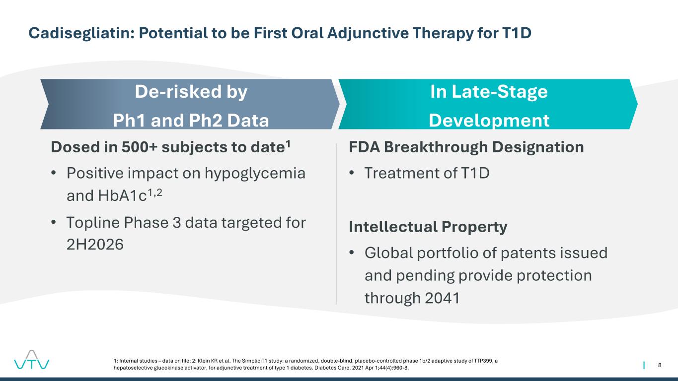 7 Hypoglycemia is often the major limiting factor in the glycemic management of T1D3 Hypoglycemia is common in people with T1D and most have several mild to moderate events per week4 Hypoglycemic events range from life-disruptive to life- threatening ~9.9M people living with T1D globally, expected to grow to 14.7M by 20401 By not achieving the ADA recommended target of HbA1c <7.0%, people with T1D are exposed to an increased risk of diabetes- related complications3 Since insulin was discovered in 1921, no oral adjunctive therapy to treat T1D has been approved in the U.S. 1.5M with type 1 diabetes in the U.S. ~75% with T1D fail to lower their blood glucose to achieve target A1c2 0 oral adjunctive therapies for T1D Cadisegliatin: A Large Opportunity in a Long-Underserved Market 1: Type 1 Diabetes Index, Last accessed on February 20, 2026.; 2: Ebekozien O, et al. Longitudinal trends in glycemic outcomes and technology use for over 48,000 people with type 1 diabetes (2016–2022) from the T1D exchange quality improvement collaborative. Diab Technol Ther 2023 Nov;25(11):765-73.; 3: ADA Standard of Care 2026.; 4: Breakthrough T1D website. Last accessed on February 20, 2026.