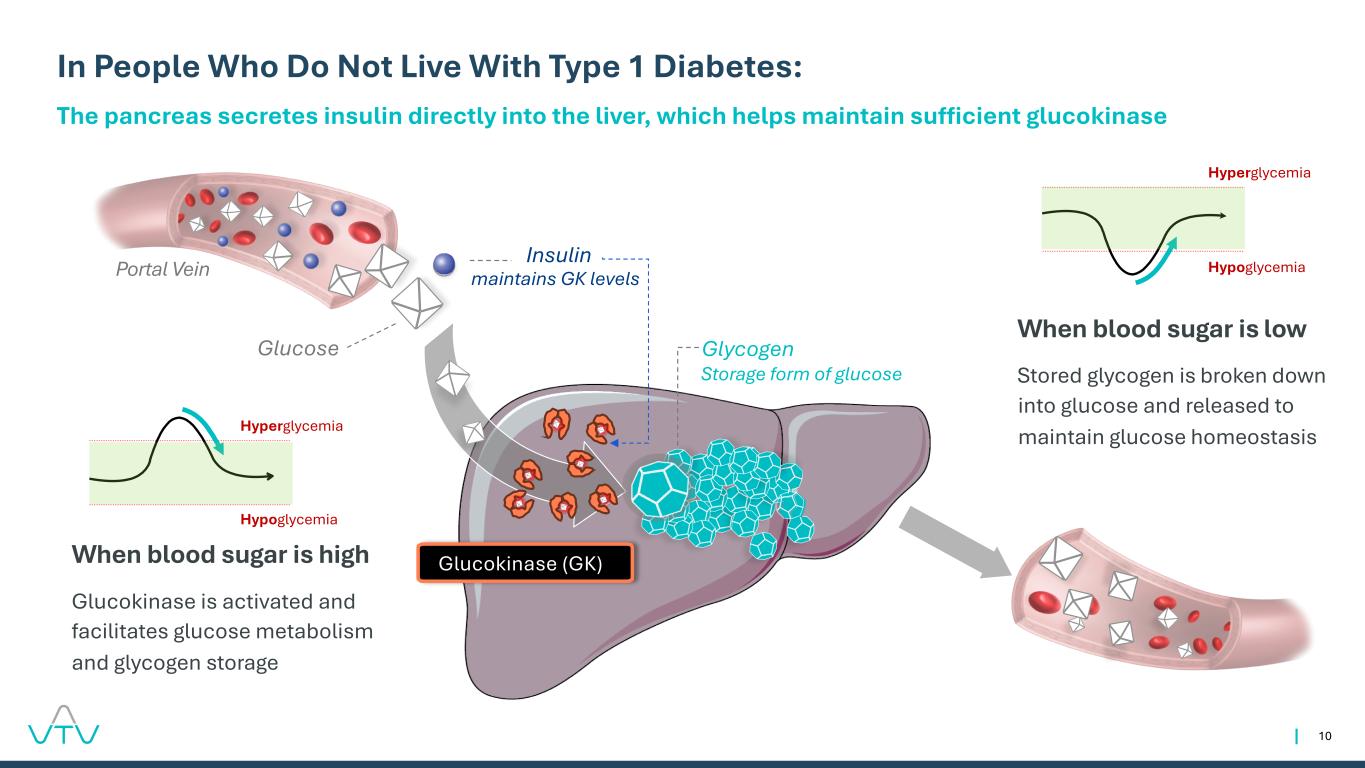 10 Insulin When blood sugar is low Stored glycogen is broken down into glucose and released to maintain glucose homeostasis Glucokinase (GK) Portal Vein The pancreas secretes insulin directly into the liver, which helps maintain sufficient glucokinase In People Who Do Not Live With Type 1 Diabetes: Hyperglycemia Hypoglycemia Hyperglycemia Hypoglycemia When blood sugar is high Glucokinase is activated and facilitates glucose metabolism and glycogen storage Glycogen maintains GK levels Glucose Storage form of glucose
