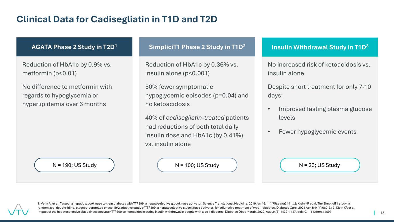 12 Hyperglycemia Hypoglycemia When blood sugar is high Glucokinase activity is increased despite low insulin levels, increasing glucose metabolism and glycogen Glycogen Activates glucokinase in the liver, lowering blood glucose, improving glucose homeostasis & glycogen storage Cadisegliatin, a Glucokinase Activator, Restores Glucose Metabolism in the Liver Portal Vein Cadisegliatin Hyperglycemia Hypoglycemia When blood sugar is low Glycogen is available to maintain glucose homeostasis and prevent hypoglycemia Glucose