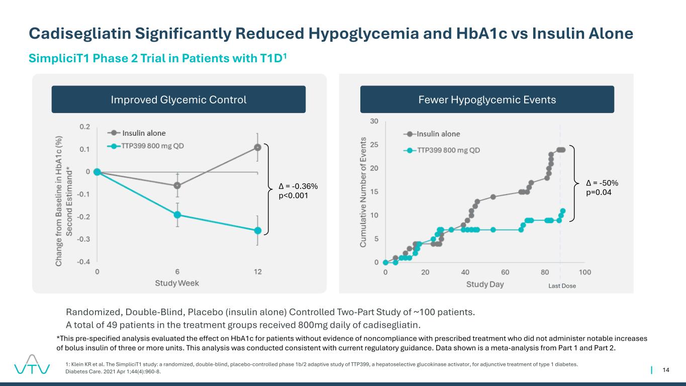 13 AGATA Phase 2 Study in T2D1 Reduction of HbA1c by 0.9% vs. metformin (p<0.01) No difference to metformin with regards to hypoglycemia or hyperlipidemia over 6 months N = 190; US Study 1: Vella A, et al. Targeting hepatic glucokinase to treat diabetes with TTP399, a hepatoselective glucokinase activator. Science Translational Medicine. 2019 Jan 16;11(475):eaau3441.; 2: Klein KR et al. The SimpliciT1 study: a randomized, double-blind, placebo-controlled phase 1b/2 adaptive study of TTP399, a hepatoselective glucokinase activator, for adjunctive treatment of type 1 diabetes. Diabetes Care. 2021 Apr 1;44(4):960-8.; 3: Klein KR et al. Impact of the hepatoselective glucokinase activator TTP399 on ketoacidosis during insulin withdrawal in people with type 1 diabetes. Diabetes Obes Metab. 2022, Aug;24(8):1439–1447. doi:10.1111/dom.14697. Clinical Data for Cadisegliatin in T1D and T2D Insulin Withdrawal Study in T1D3 No increased risk of ketoacidosis vs. insulin alone Despite short treatment for only 7-10 days: • Improved fasting plasma glucose levels • Fewer hypoglycemic events N = 23; US Study SimpliciT1 Phase 2 Study in T1D2 Reduction of HbA1c by 0.36% vs. insulin alone (p<0.001) 50% fewer symptomatic hypoglycemic episodes (p=0.04) and no ketoacidosis 40% of cadisegliatin-treated patients had reductions of both total daily insulin dose and HbA1c (by 0.41%) vs. insulin alone N = 100; US Study