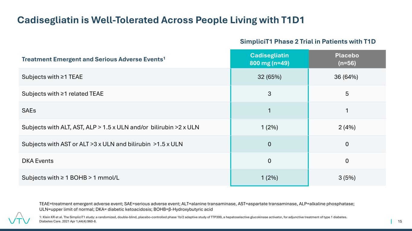 14 Improved Glycemic Control Fewer Hypoglycemic Events Δ = -0.36% p<0.001 Last Dose Δ = -50% p=0.04 Randomized, Double-Blind, Placebo (insulin alone) Controlled Two-Part Study of ~100 patients. A total of 49 patients in the treatment groups received 800mg daily of cadisegliatin. SimpliciT1 Phase 2 Trial in Patients with T1D1 Cadisegliatin Significantly Reduced Hypoglycemia and HbA1c vs Insulin Alone *This pre-specified analysis evaluated the effect on HbA1c for patients without evidence of noncompliance with prescribed treatment who did not administer notable increases of bolus insulin of three or more units. This analysis was conducted consistent with current regulatory guidance. Data shown is a meta-analysis from Part 1 and Part 2. 1: Klein KR et al. The SimpliciT1 study: a randomized, double-blind, placebo-controlled phase 1b/2 adaptive study of TTP399, a hepatoselective glucokinase activator, for adjunctive treatment of type 1 diabetes. Diabetes Care. 2021 Apr 1;44(4):960-8.