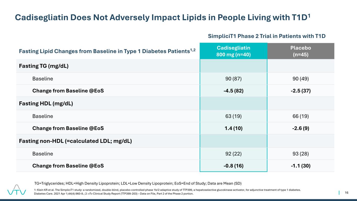 15 Cadisegliatin is Well-Tolerated Across People Living with T1D1 1: Klein KR et al. The SimpliciT1 study: a randomized, double-blind, placebo-controlled phase 1b/2 adaptive study of TTP399, a hepatoselective glucokinase activator, for adjunctive treatment of type 1 diabetes. Diabetes Care. 2021 Apr 1;44(4):960-8. Treatment Emergent and Serious Adverse Events1 Cadisegliatin 800 mg (n=49) Placebo (n=56) Subjects with ≥1 TEAE 32 (65%) 36 (64%) Subjects with ≥1 related TEAE 3 5 SAEs 1 1 Subjects with ALT, AST, ALP > 1.5 x ULN and/or bilirubin >2 x ULN 1 (2%) 2 (4%) Subjects with AST or ALT >3 x ULN and bilirubin >1.5 x ULN 0 0 DKA Events 0 0 Subjects with ≥ 1 BOHB > 1 mmol/L 1 (2%) 3 (5%) TEAE=treatment emergent adverse event; SAE=serious adverse event; ALT=alanine transaminase, AST=aspartate transaminase, ALP=alkaline phosphatase; ULN=upper limit of normal; DKA= diabetic ketoacidosis; BOHB=β-Hydroxybutyric acid SimpliciT1 Phase 2 Trial in Patients with T1D