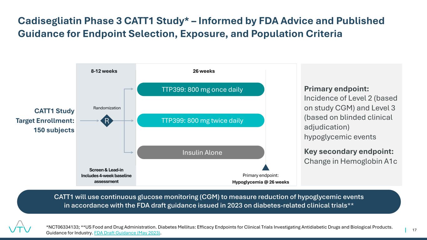 16 Cadisegliatin Does Not Adversely Impact Lipids in People Living with T1D1 1: Klein KR et al. The SimpliciT1 study: a randomized, double-blind, placebo-controlled phase 1b/2 adaptive study of TTP399, a hepatoselective glucokinase activator, for adjunctive treatment of type 1 diabetes. Diabetes Care. 2021 Apr 1;44(4):960-8.; 2: vTv Clinical Study Report (TTP399-203) – Data on File, Part 2 of the Phase 2 portion. Fasting Lipid Changes from Baseline in Type 1 Diabetes Patients1,2 Cadisegliatin 800 mg (n=40) Placebo (n=45) Fasting TG (mg/dL) Baseline 90 (87) 90 (49) Change from Baseline @EoS -4.5 (82) -2.5 (37) Fasting HDL (mg/dL) Baseline 63 (19) 66 (19) Change from Baseline @EoS 1.4 (10) -2.6 (9) Fasting non-HDL (=calculated LDL; mg/dL) Baseline 92 (22) 93 (28) Change from Baseline @EoS -0.8 (16) -1.1 (30) TG=Triglycerides; HDL=High Density Lipoprotein; LDL=Low Density Lipoprotein; EoS=End of Study; Data are Mean (SD) SimpliciT1 Phase 2 Trial in Patients with T1D